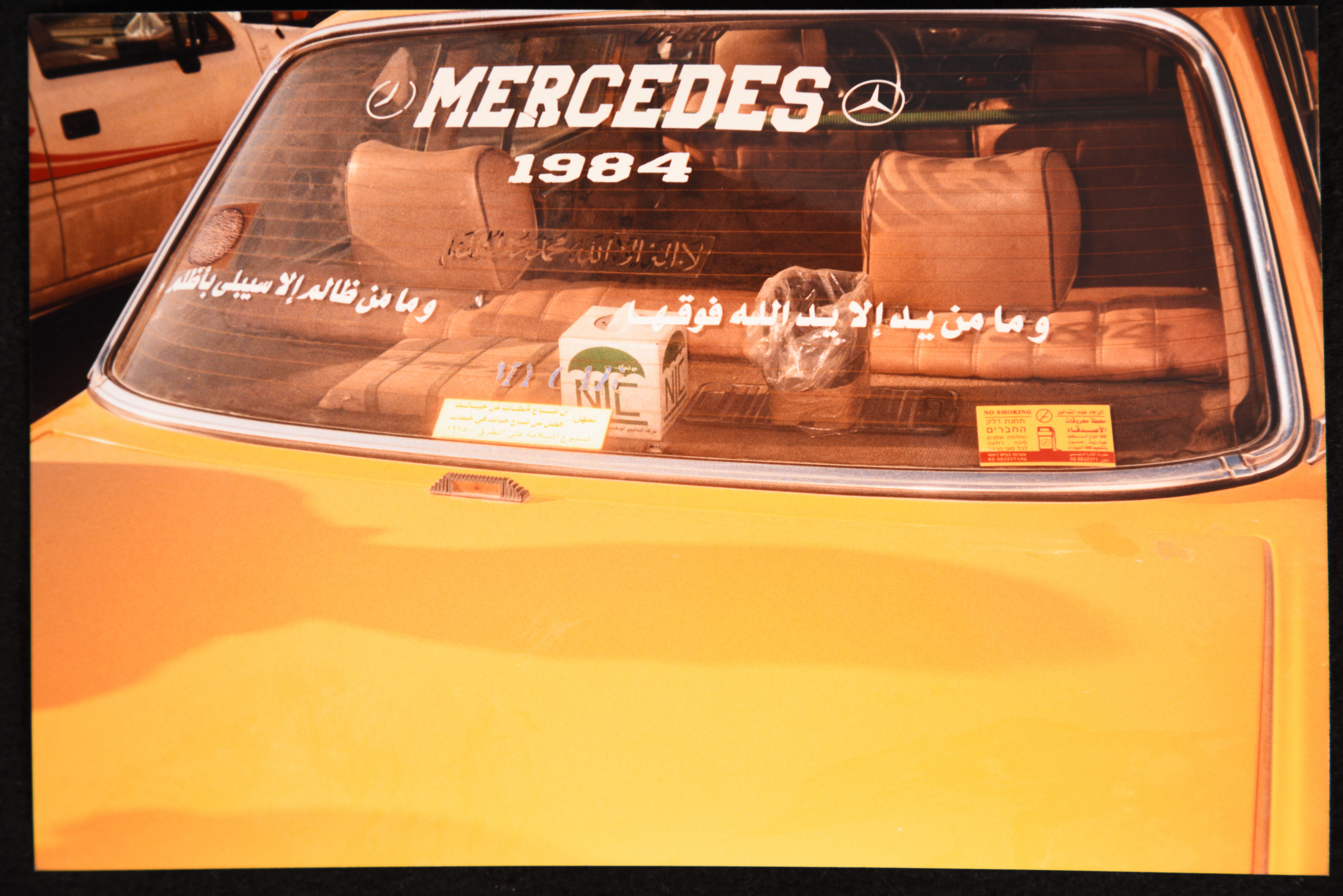 صورة ملونة لعبارات دينية مكتوبة على الجهة الخلفية لسيارة نقل ركاب عمومية بالإضافة الى اسم الشركة المنتجة للسيارات "مرسيديس".