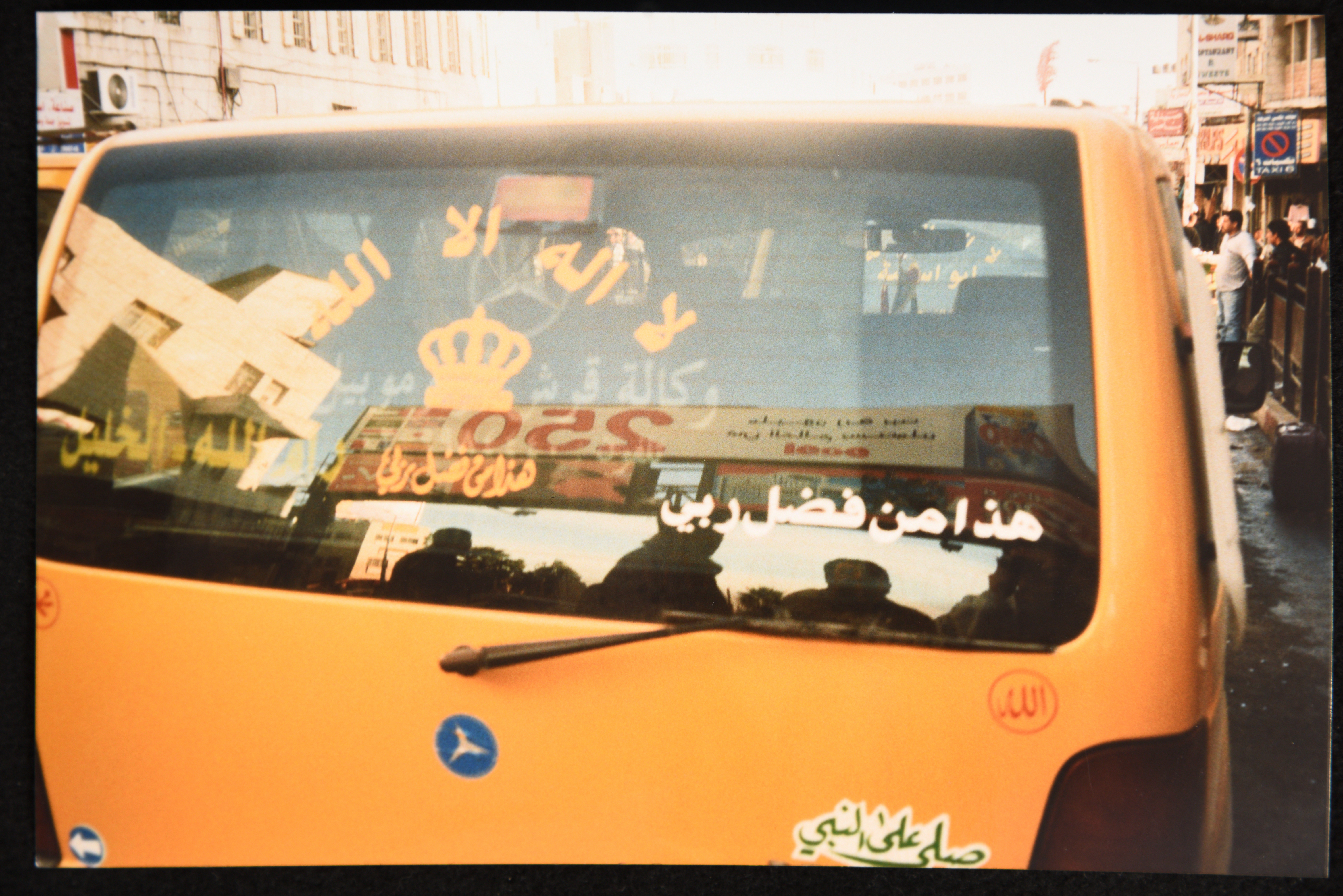 صورة ملونة لعبارات دينية مكتوبة على الجهة الخلفية لسيارة نقل ركاب عمومية.