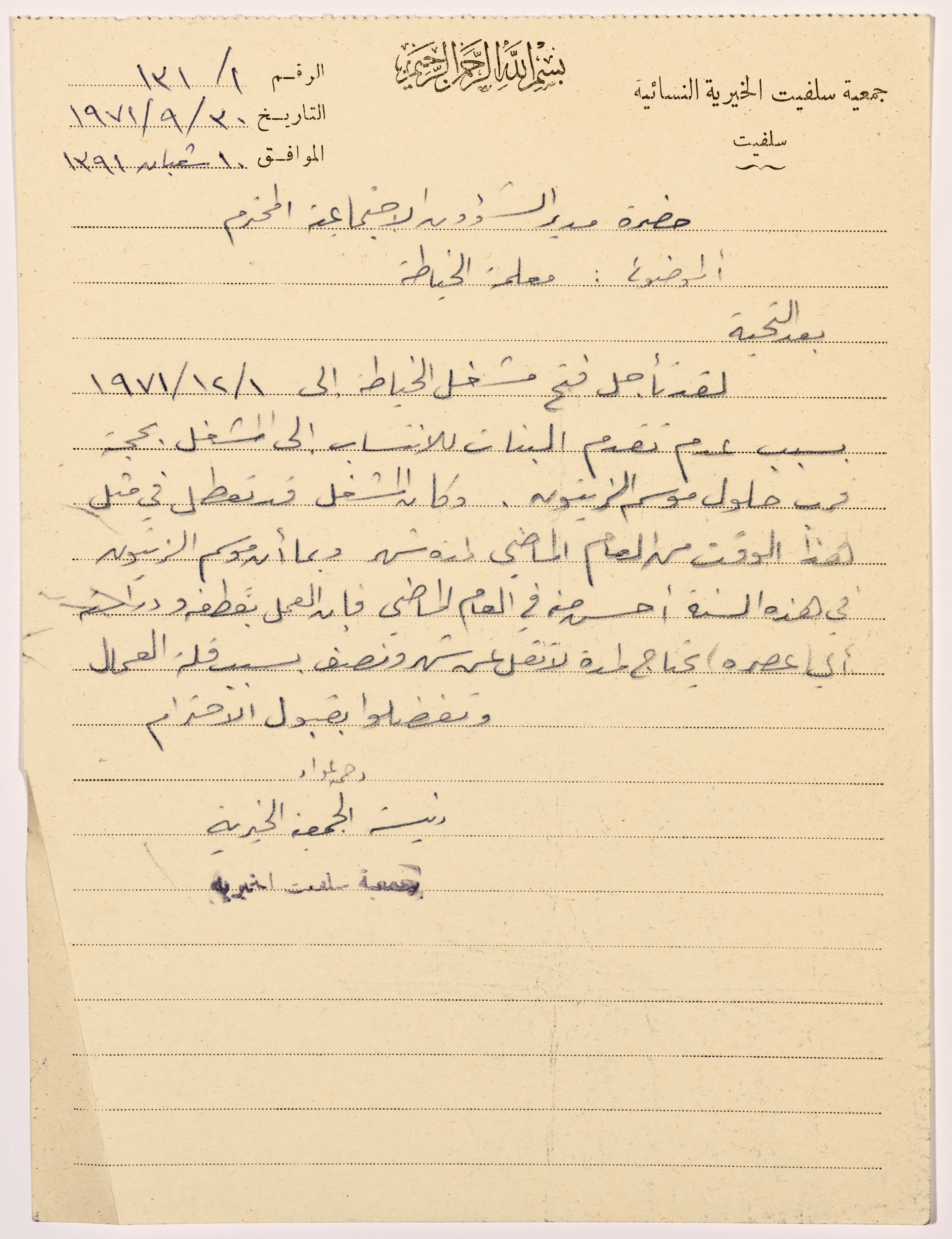 رسالة من رئيسة جمعية سلفيت الخيرية إلى مدير الشؤون الاجتماعية للواء طولكرم بخصوص عمل مشغل الخياطة التابع للجمعية