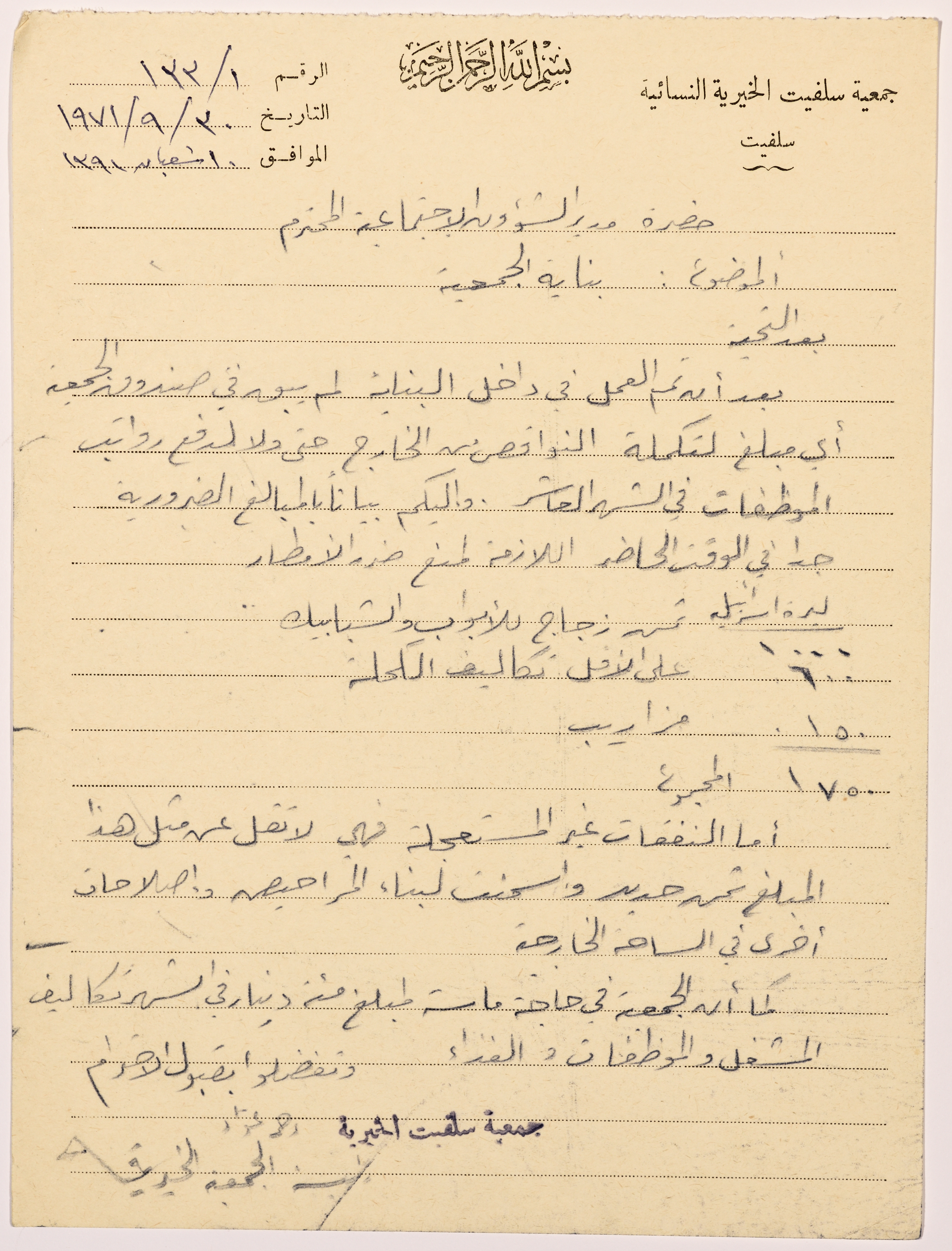 رسالة من رئيسة جمعية سلفيت الخيرية إلى مدير الشؤون الاجتماعية للواء طولكرم بخصوص تكاليف بناء جديد تابع للجمعية