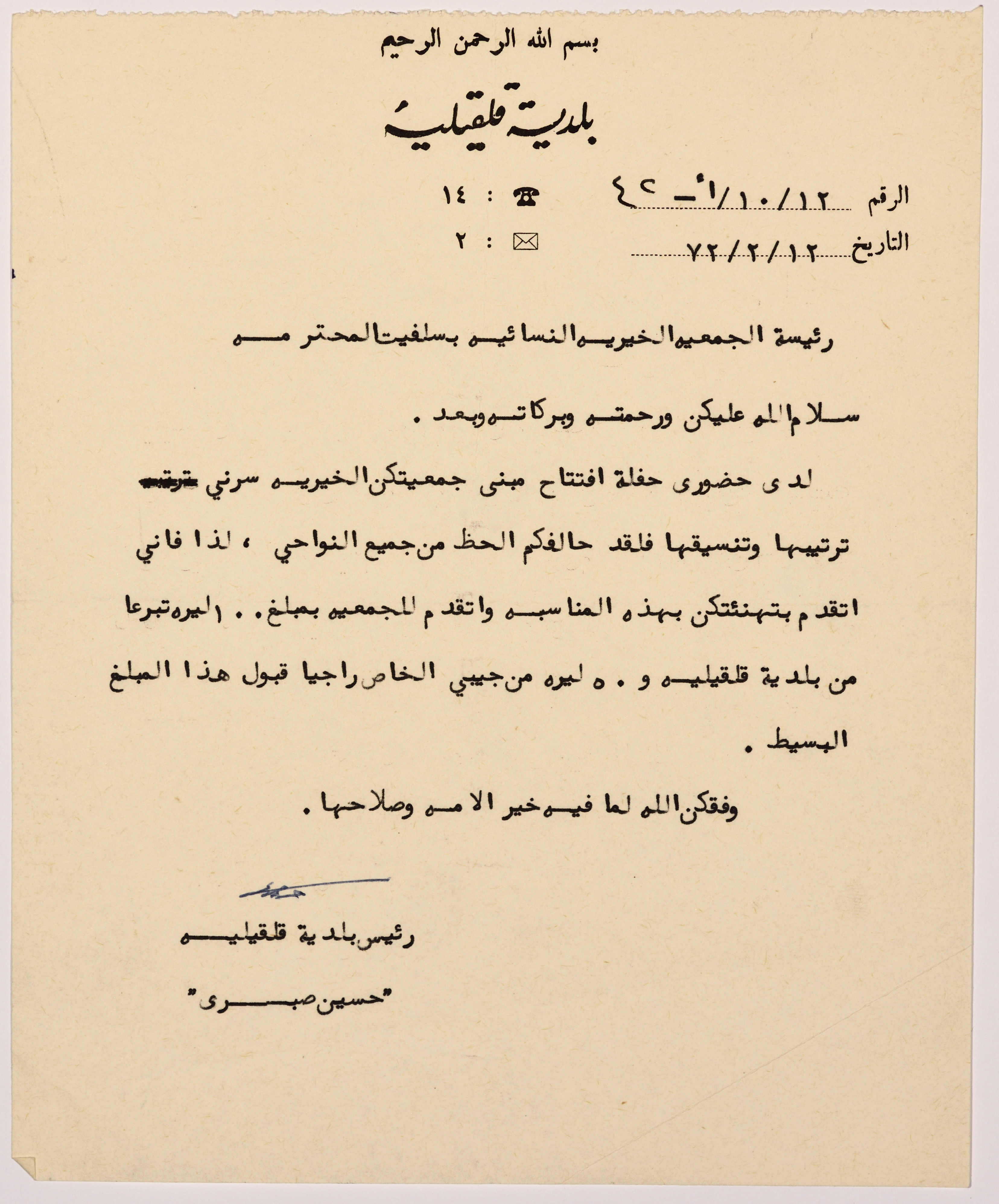 رسالة إلى رئيسة جمعية سلفيت الخيرية من رئيس بلدية قلقيلية بخصوص افتتاح بناء جديد للجمعية
