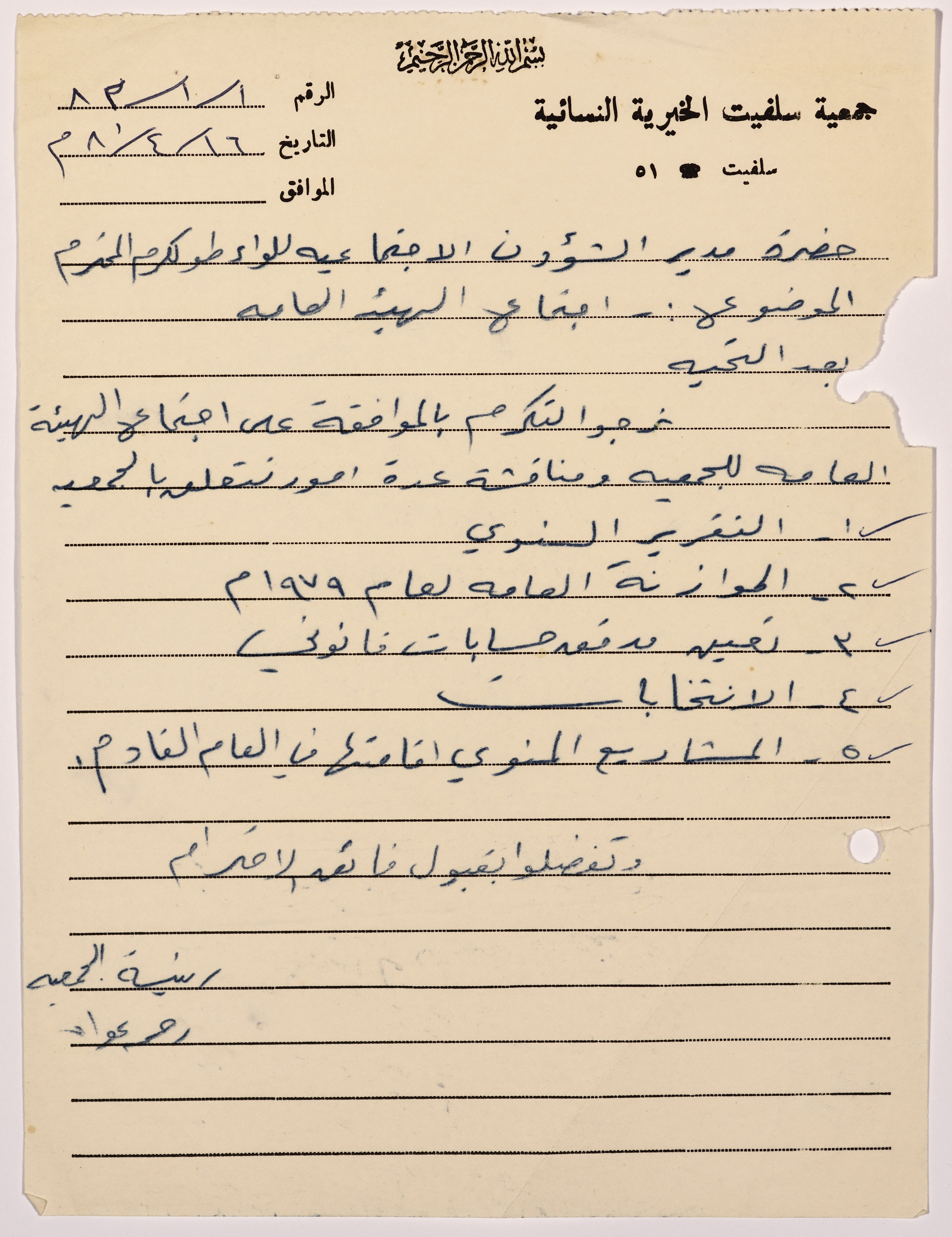 Letter from the manager of Salfeet Women Charity to the Director of Social affairs in Tulkarm district regarding the approval for the Charity's plenary