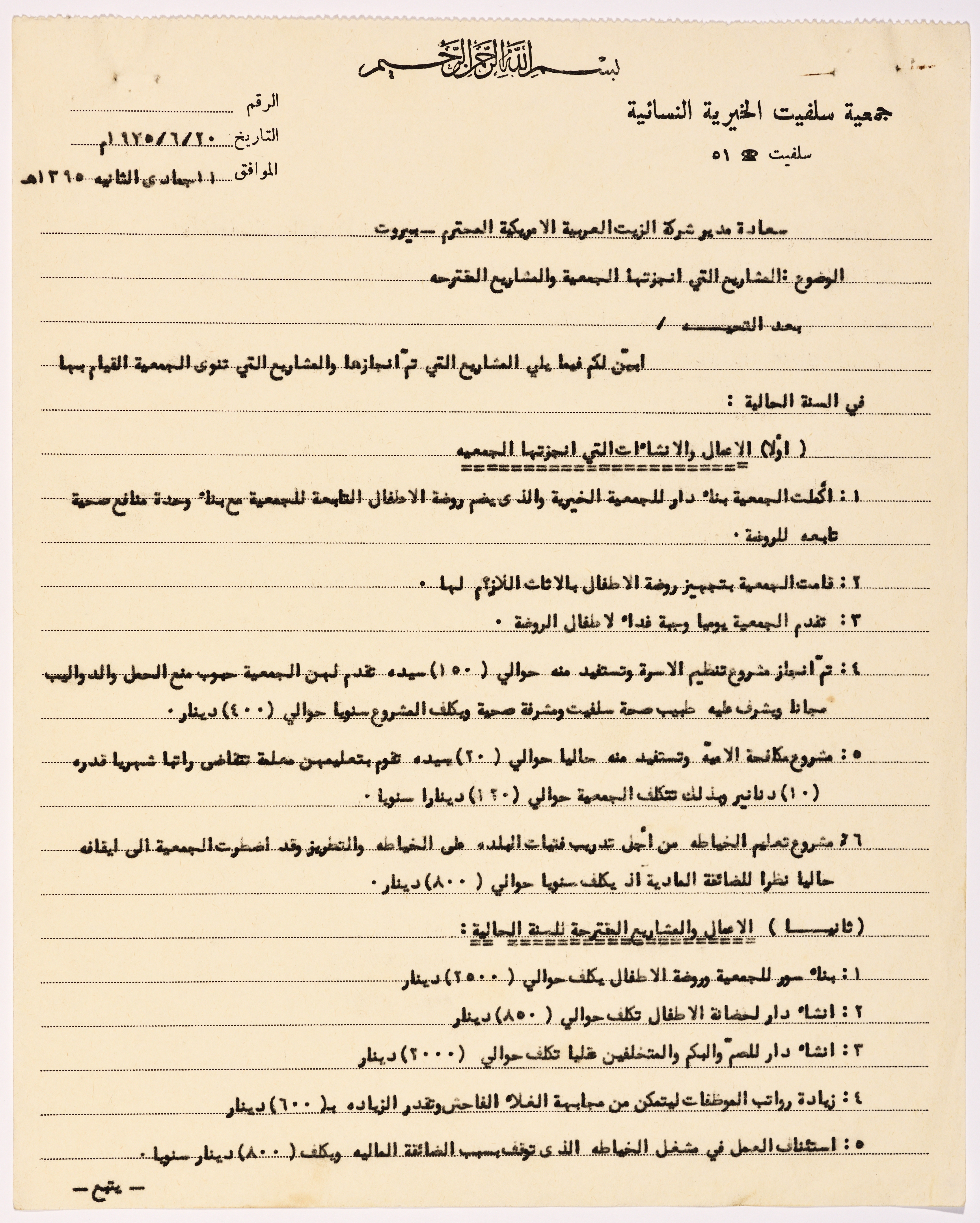 Letter from the manager of Salfeet Women Charity to the Director of Social affairs in Tulkarm district regarding the completed and proposed projects of the Charity