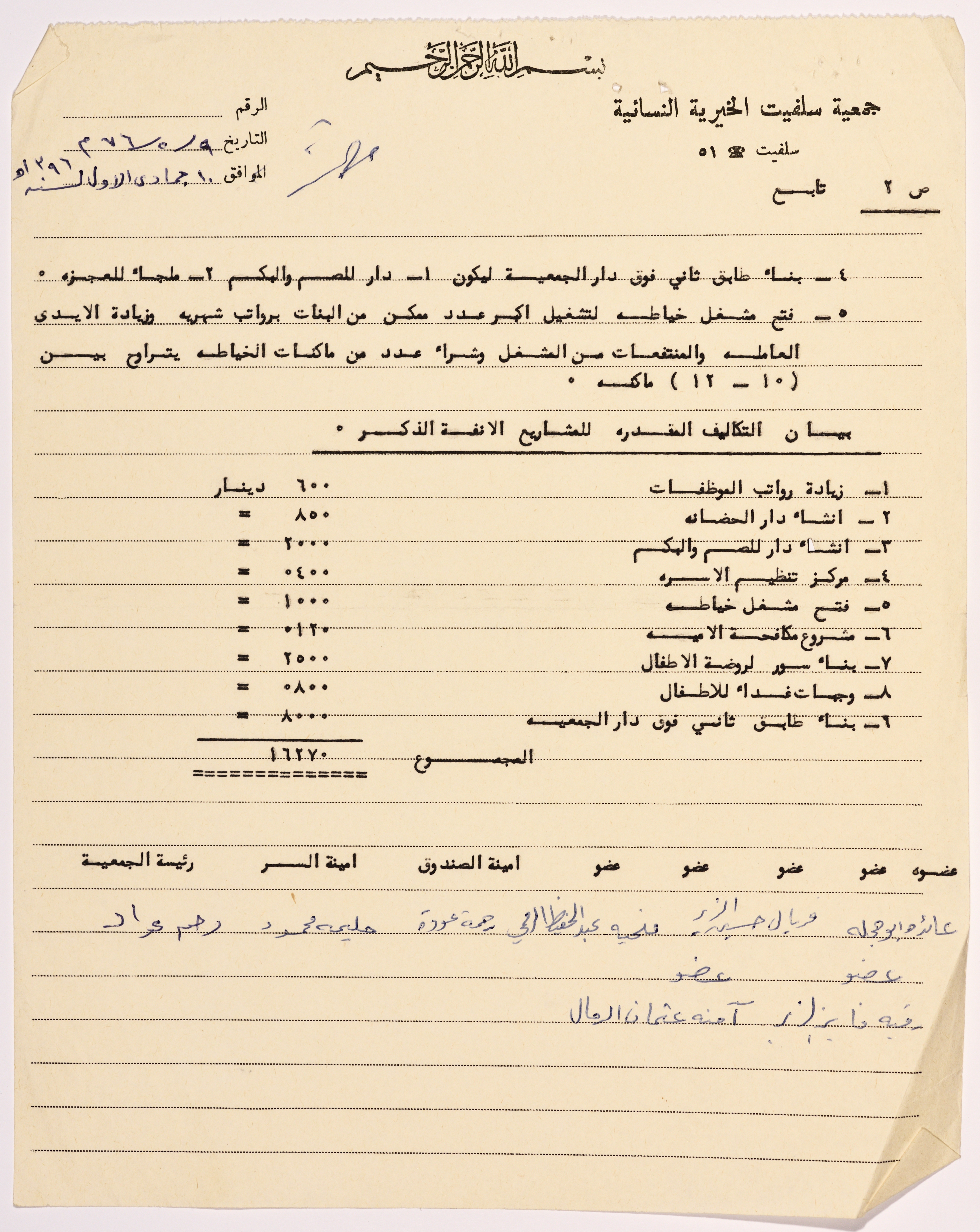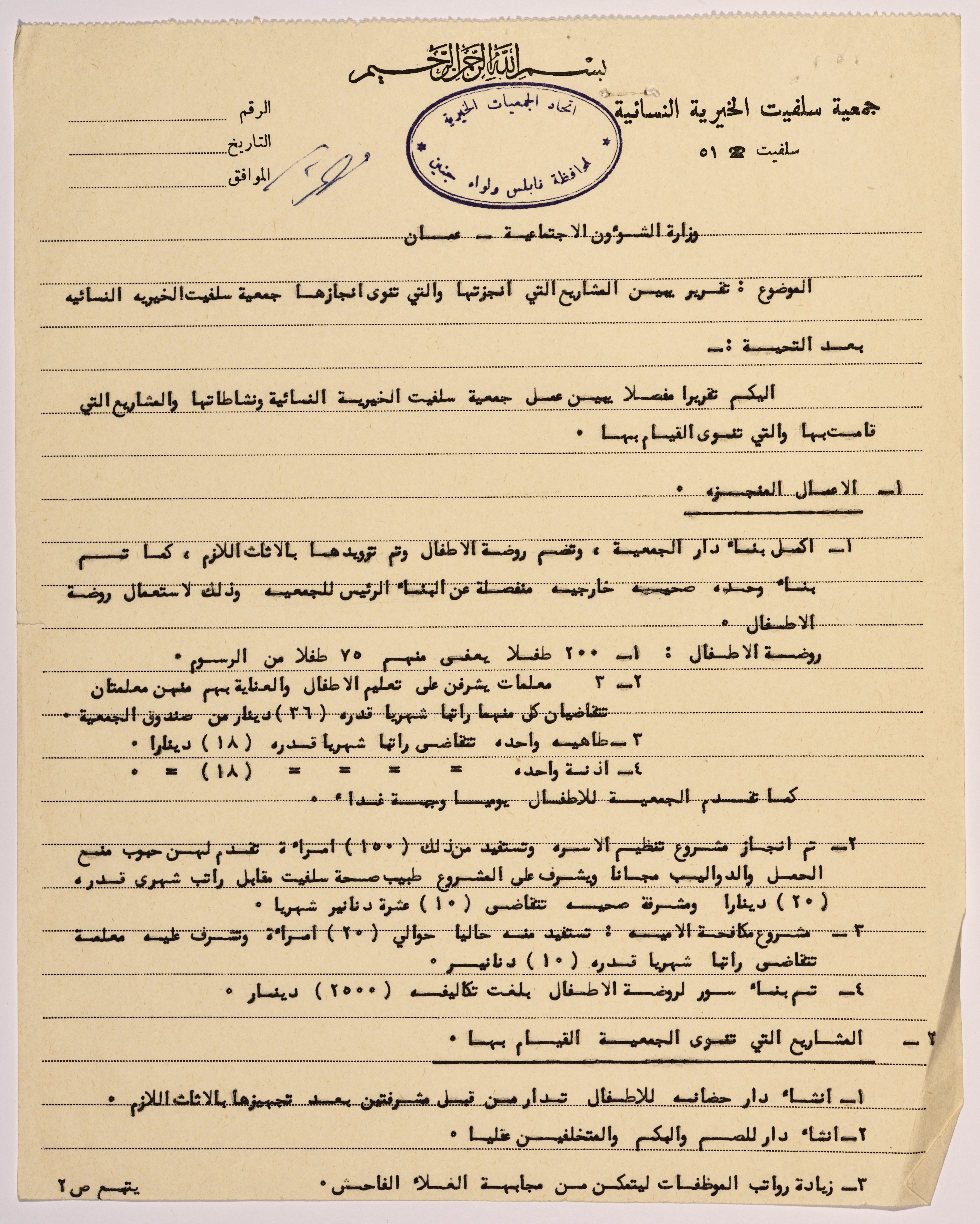 Letter from the manager of Salfeet Women Charity to the Ministry of Social Affairs in Amman regarding the completed and proposed projects of the Charity