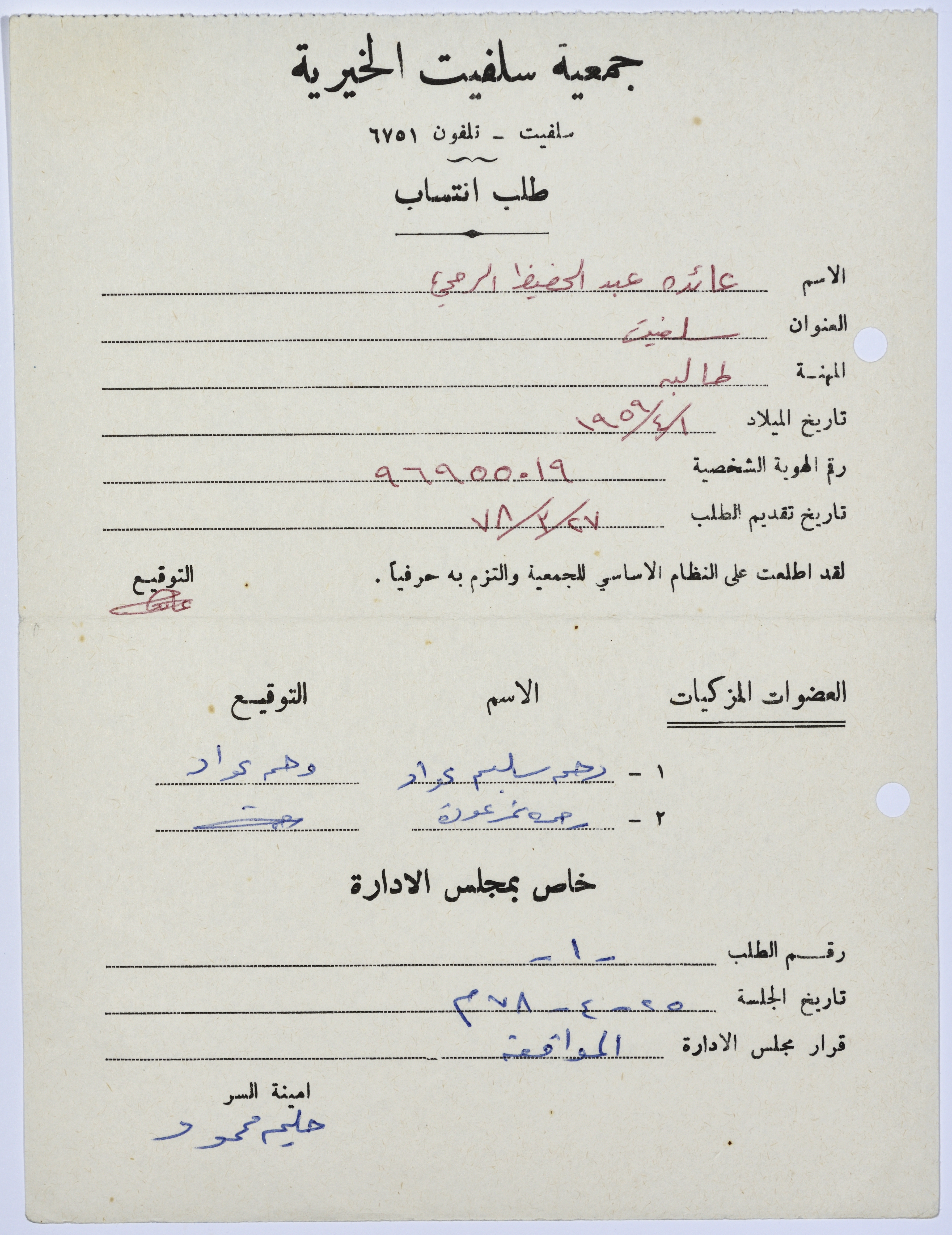 طلب انتساب لبرنامج محو الأمية في جمعية سلفيت الخيرية عام 1978