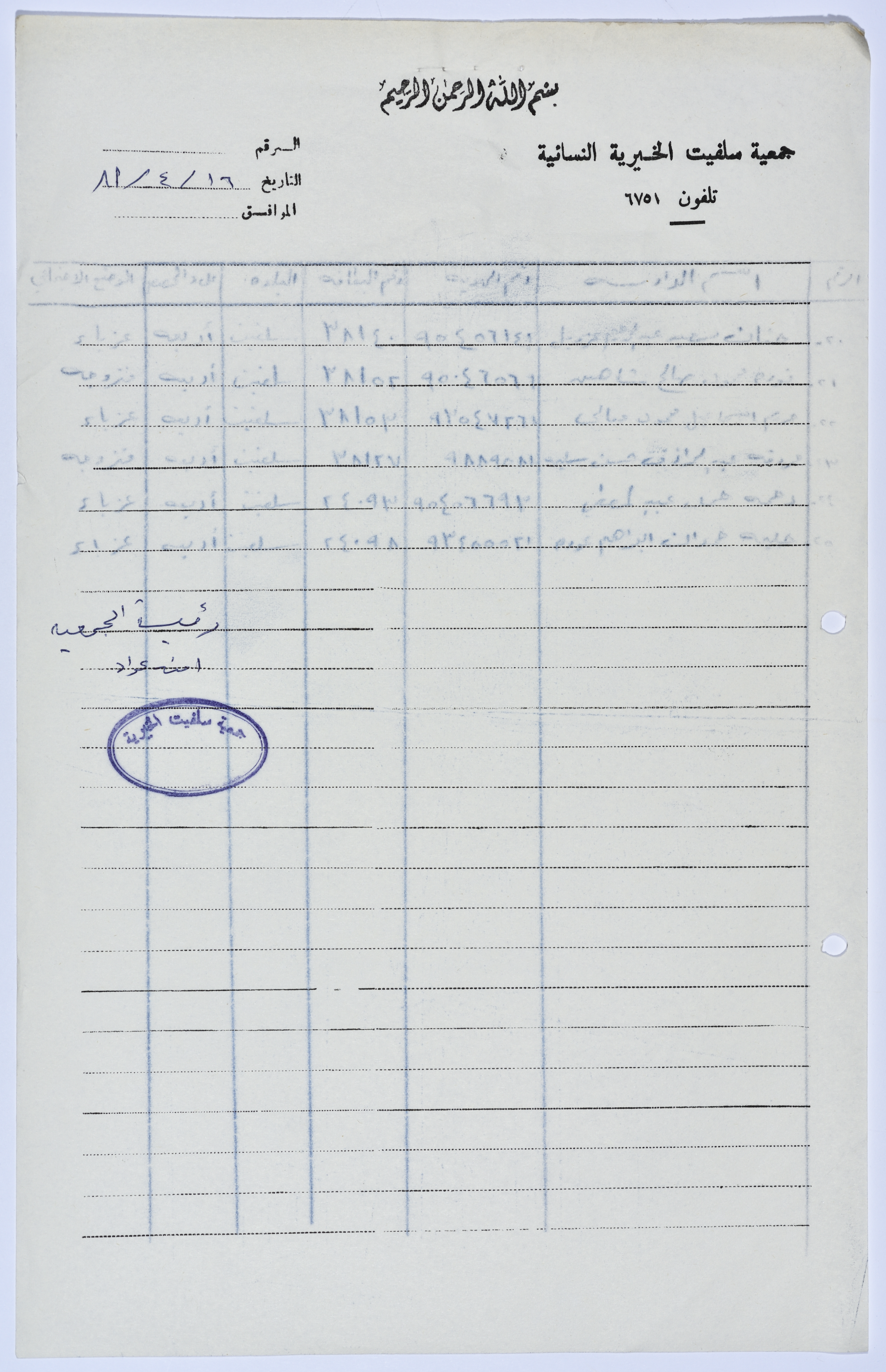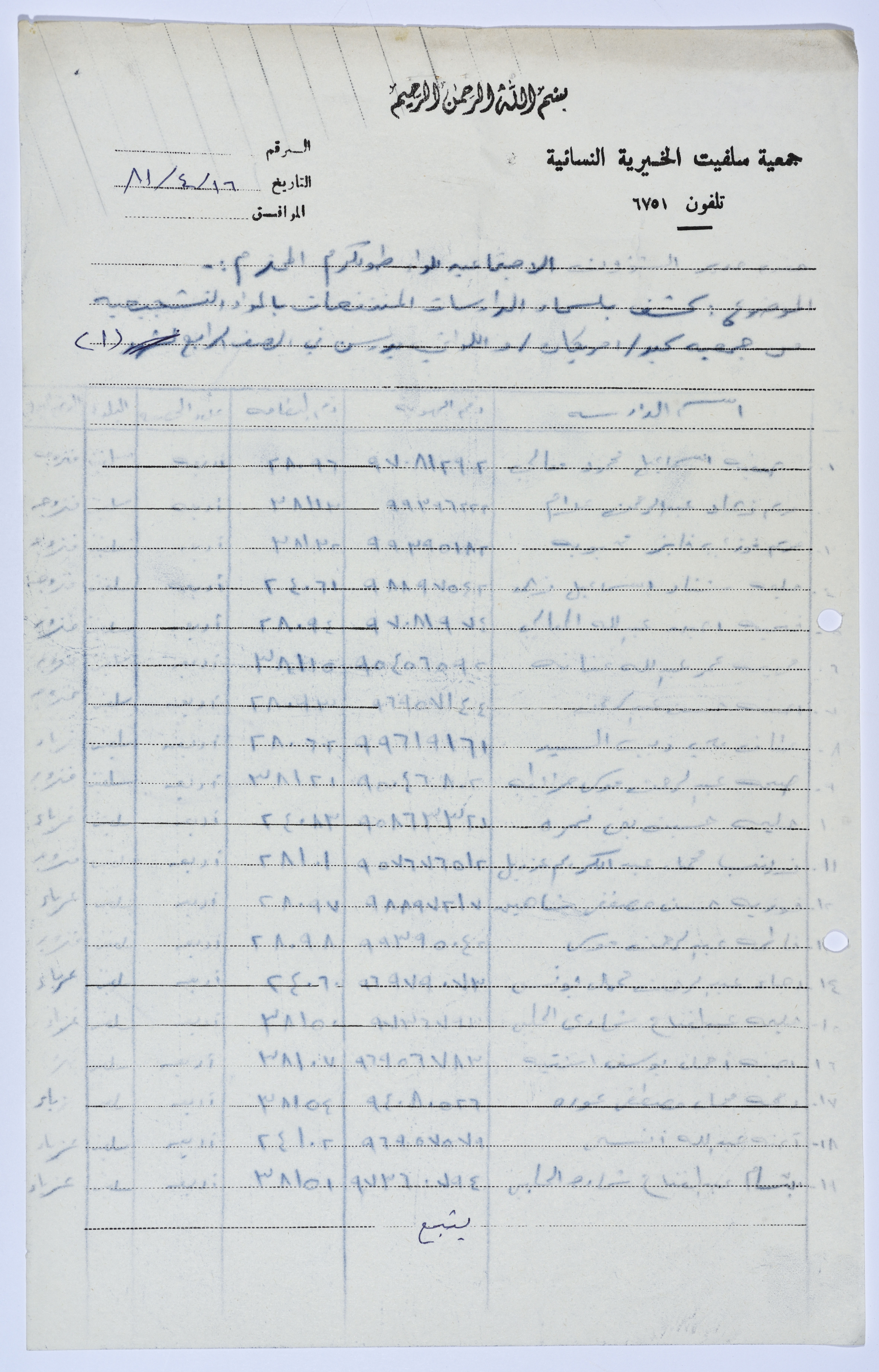 رسالة من رئيسة جمعية سلفيت الخيرية إلى مدير الشؤون الاجتماعية للواء طولكرم تتضمن كشف بأسماء الدارسات في صفوف محو الأمية التابعة لجمعية سلفيت الخيرية عام 1981.