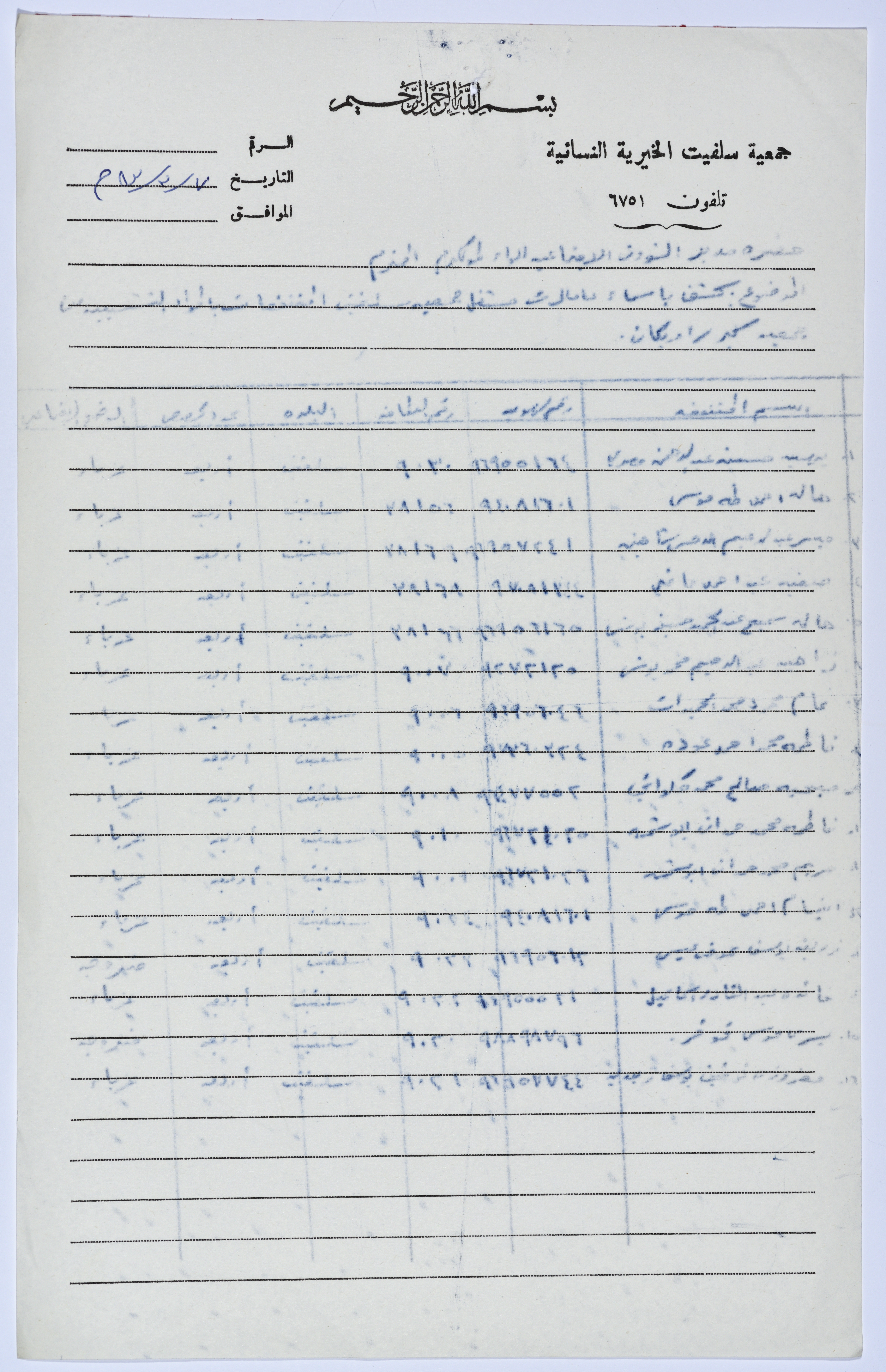 رسالة من رئيسة جمعية سلفيت الخيرية إلى مدير الشؤون الاجتماعية للواء طولكرم تتضمن كشفاً بأسماء العاملات في مشغل الخياطة التابع لجمعية سلفيت الخيرية عام 1983، ورقم الهوية، البلدة، عدد الحصص، الوضع الاجتماعي لكل عاملة.