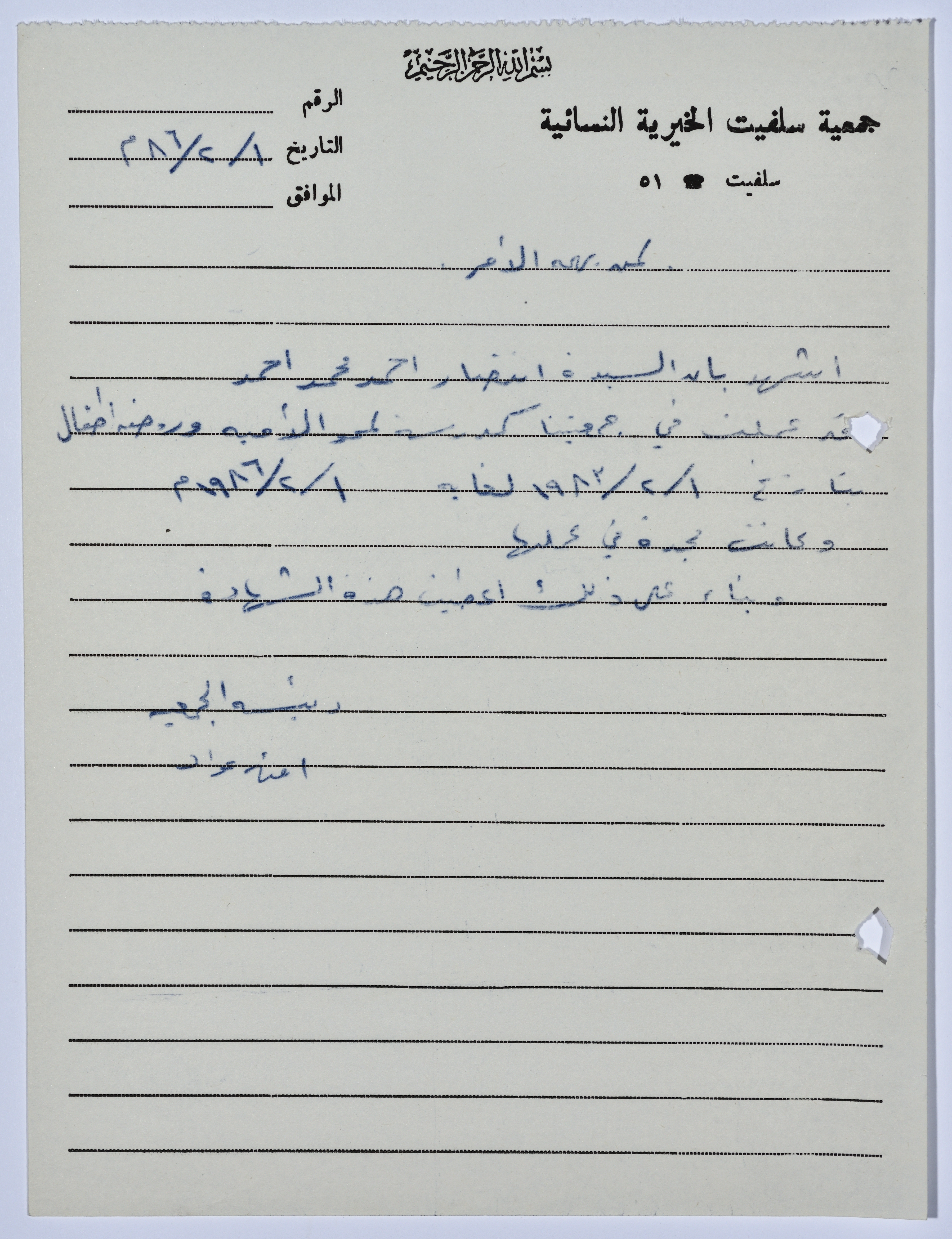 رسالة إثبات عمل من جمعية سلفيت الخيرية لإحدى معلمات رياض الأطفال ومحو الأمية