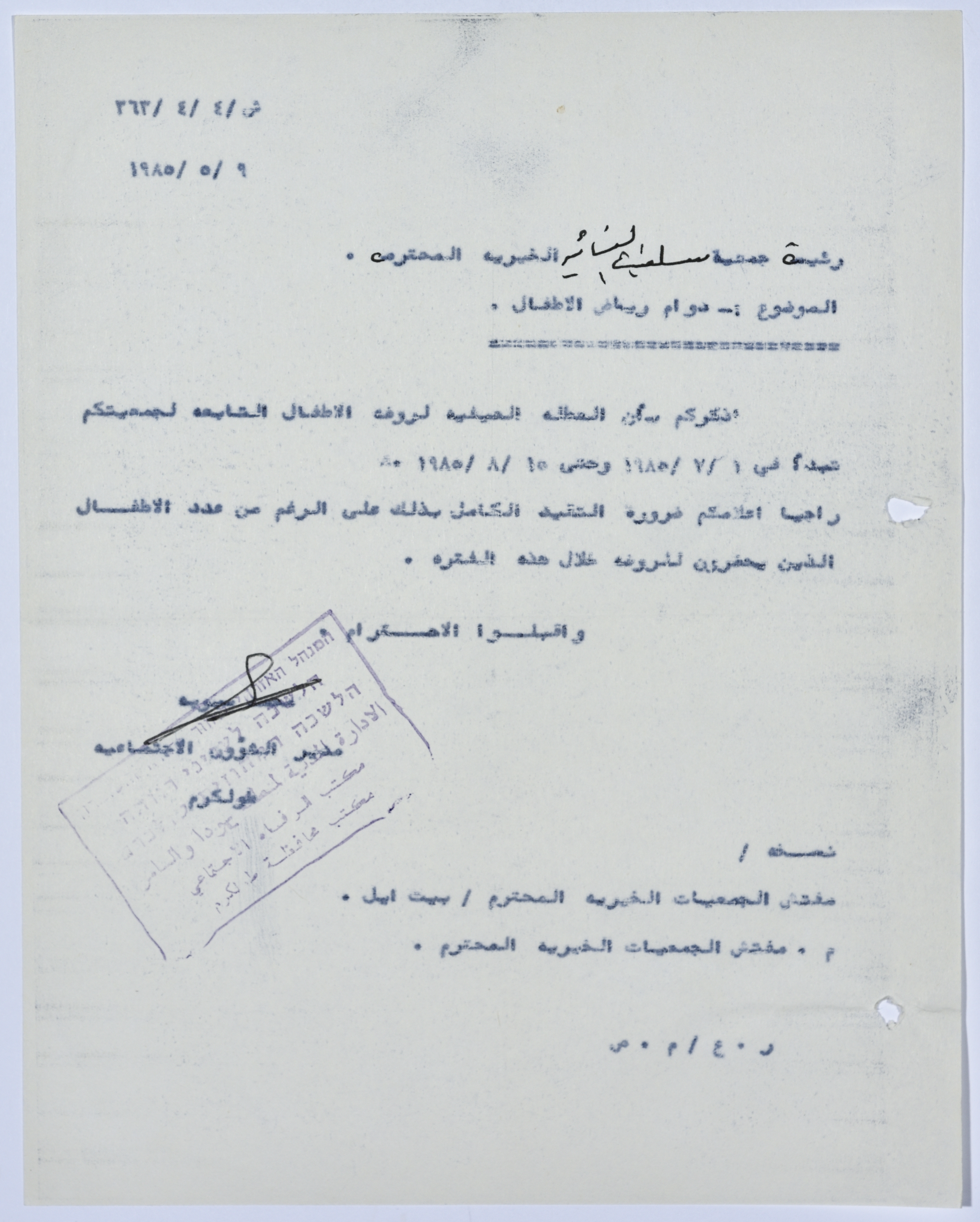 Letter to the Manager of Salfeet Women Charity from the Director of Social Affairs of the Civil Administration in the West Bank