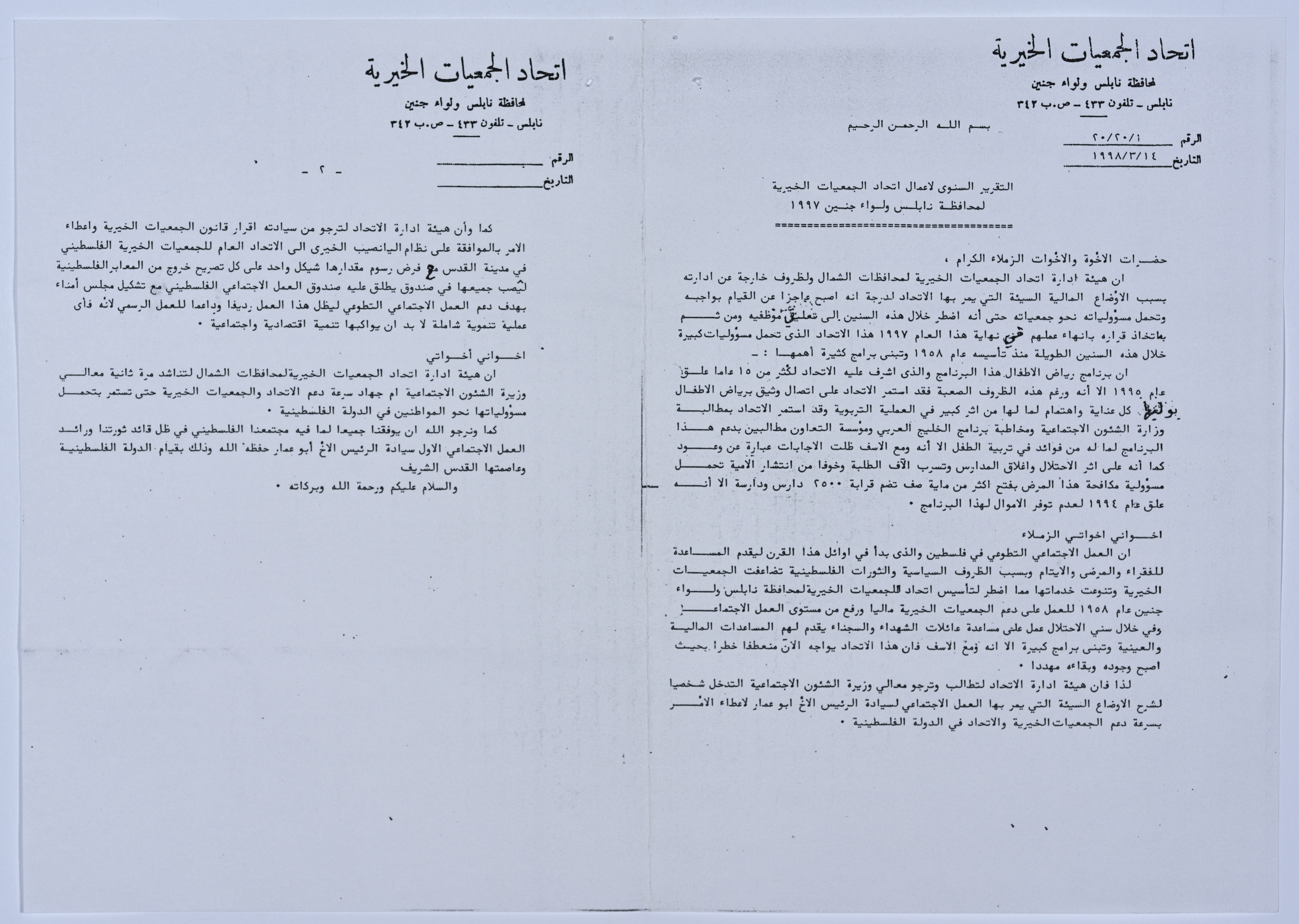 رسالة من اتحاد الجمعيات الخيرية إلى جمعية سلفيت الخيرية، لحضور اجتماع الهيئة العامة لاتحاد الجمعيات الخيرية لمحافظة نابلس ولواء جنين، ومناقشة (التقرير السنوي سنة 1997، الميزانية العمومية سنة 1997، الموازنة التقديرية 1998، تعيين مدقق حسابات). مرفق مع الرسالة التقرير السنوي لأعمال اتحاد الجمعيات الخيرية لمحافظات الشمال لعام 1997، الميزانية ,والموازنة العمومية للاتحاد، وتقرير مدقق الحسابات.