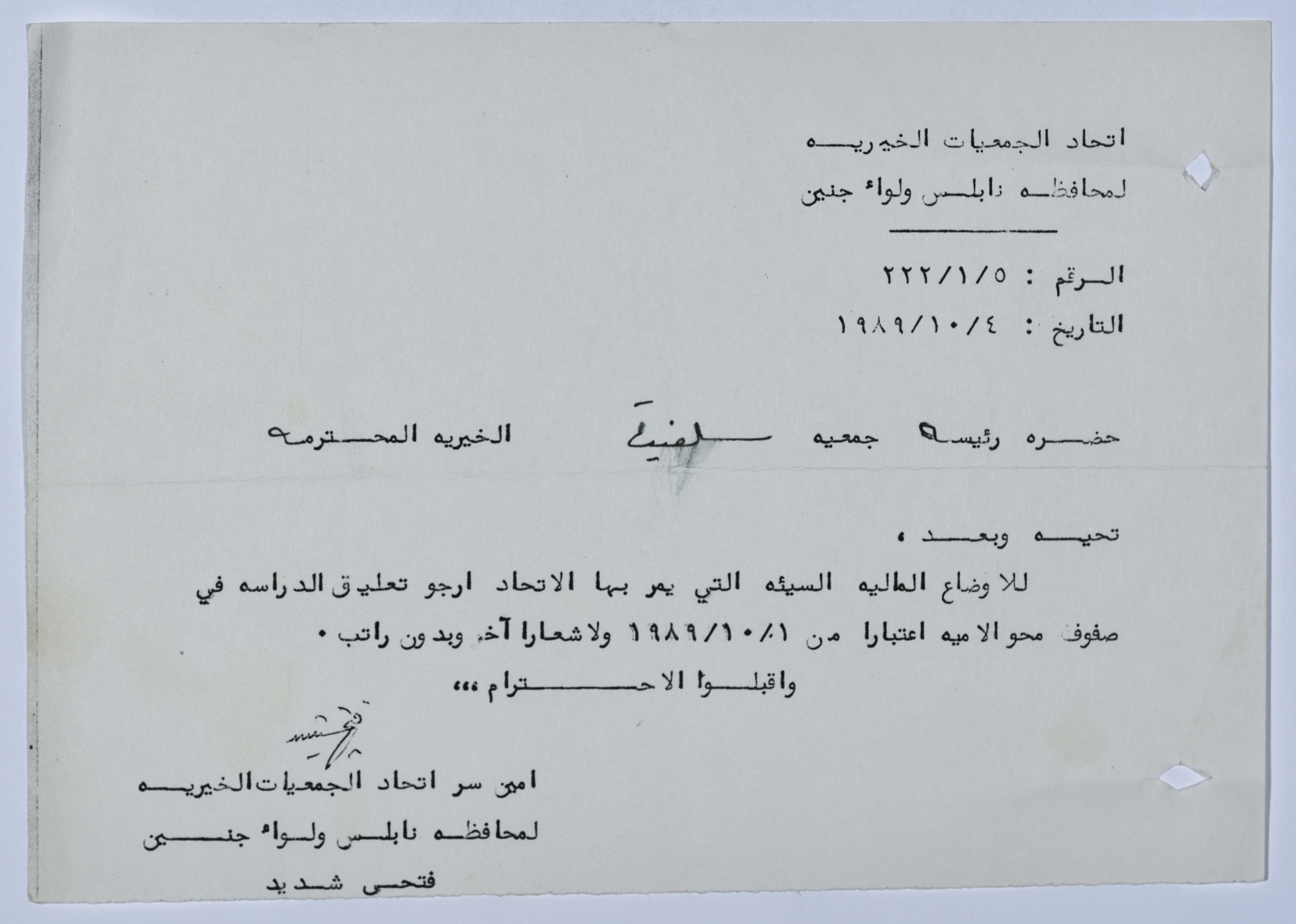 رسالة من اتحاد الجمعيات الخيرية لمحافظة نابلس ولواء جنين إلى جمعية سلفيت الخيرية بخصوص برنامج مكافحة الأمية، حيث يشير فتحي شديد أمين سر الاتحاد إلى تعليق الدراسة في الصفوف لعدم توفر أموال لمشروع مكافحة الأمية.