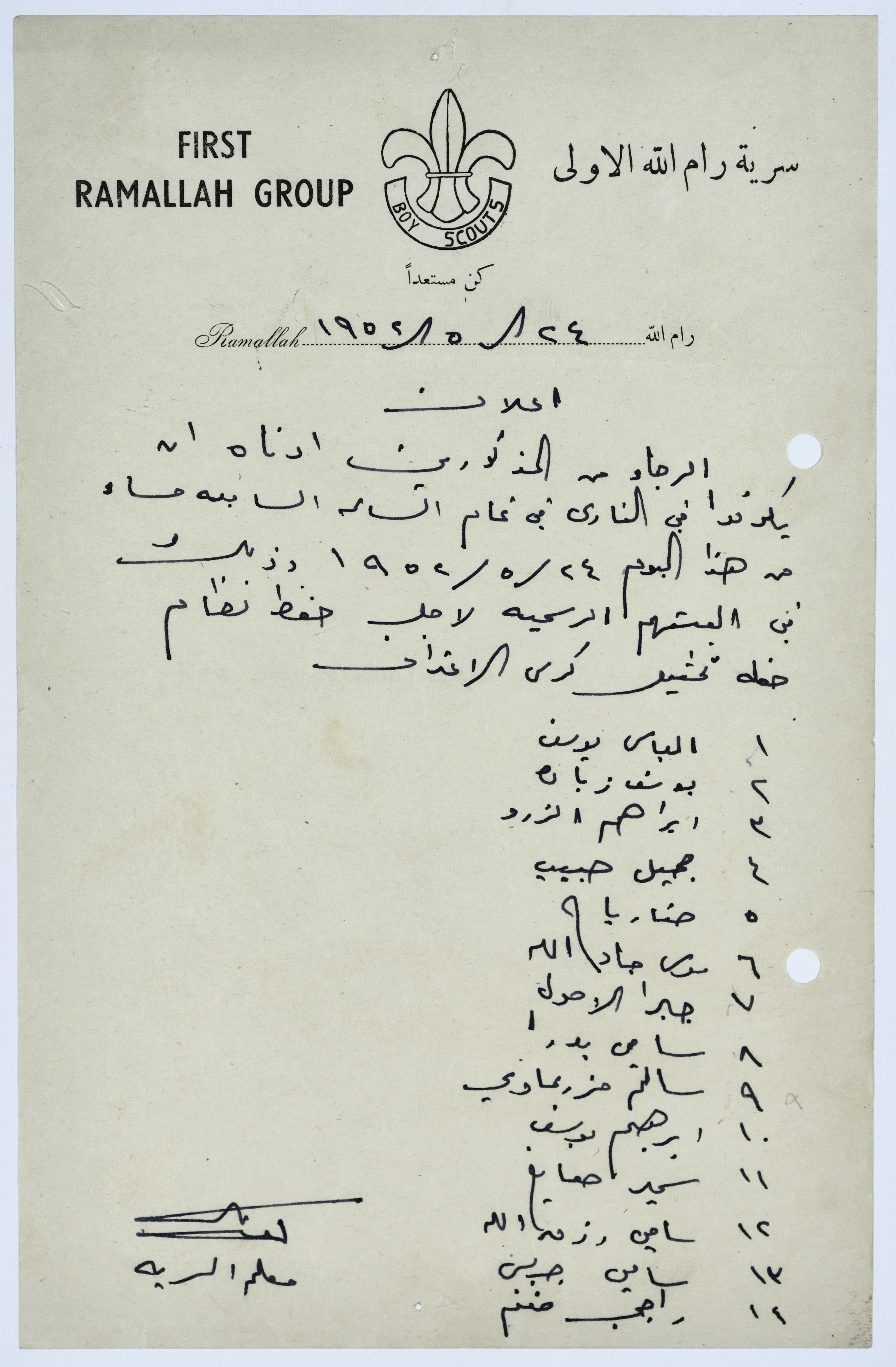 Ozrail, Samar. "The Saryyet Ramallah- First Ramallah Group Collection". Archival Inventory. 31 July- 2 October 2018. The Palestinian Museum Digital Archive.