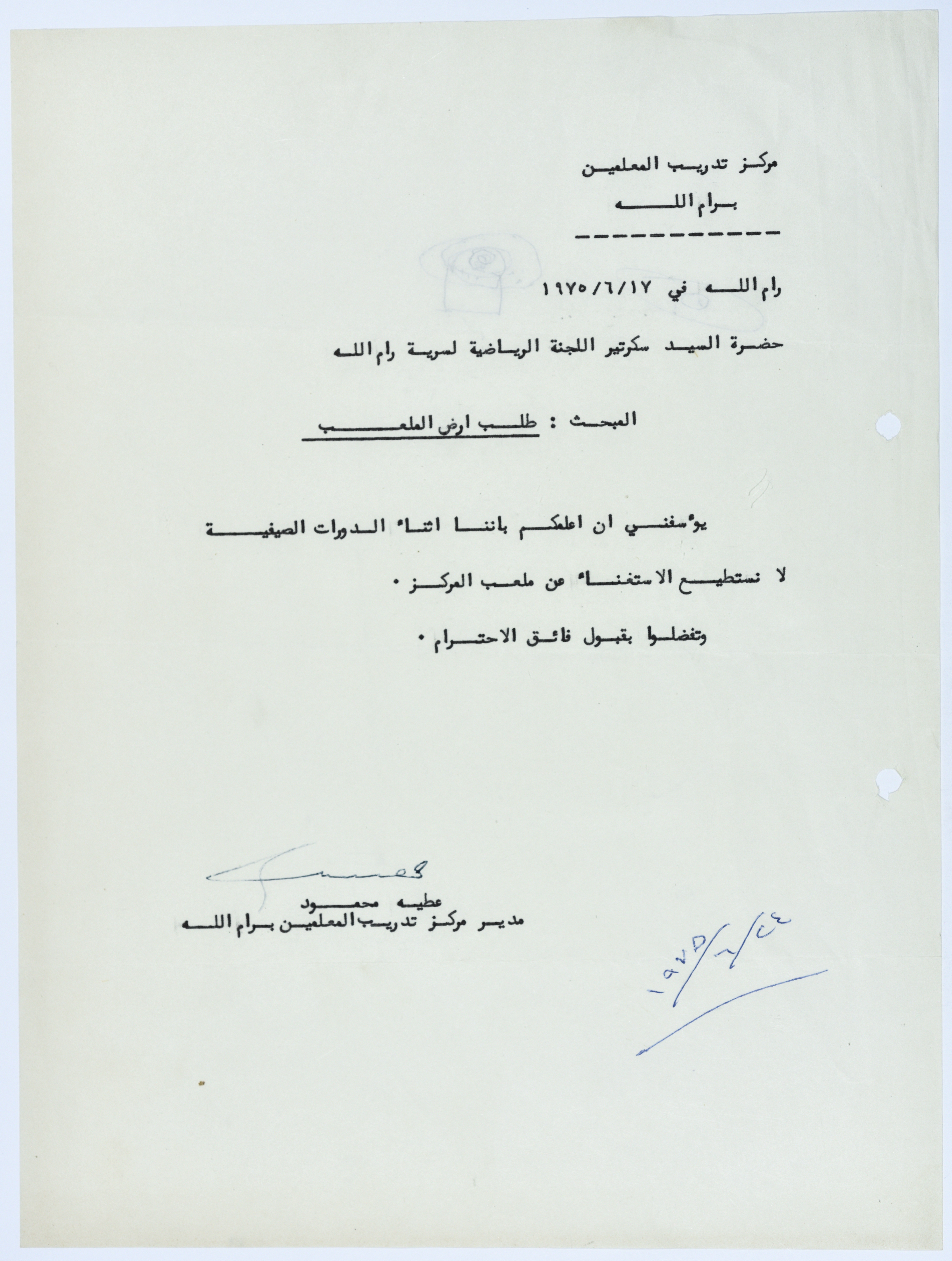 رسالة وصلت إلى سرية رام الله الأولى من مركز تدريب المعلمين في رام الله حول استخدام أرض الملعب
