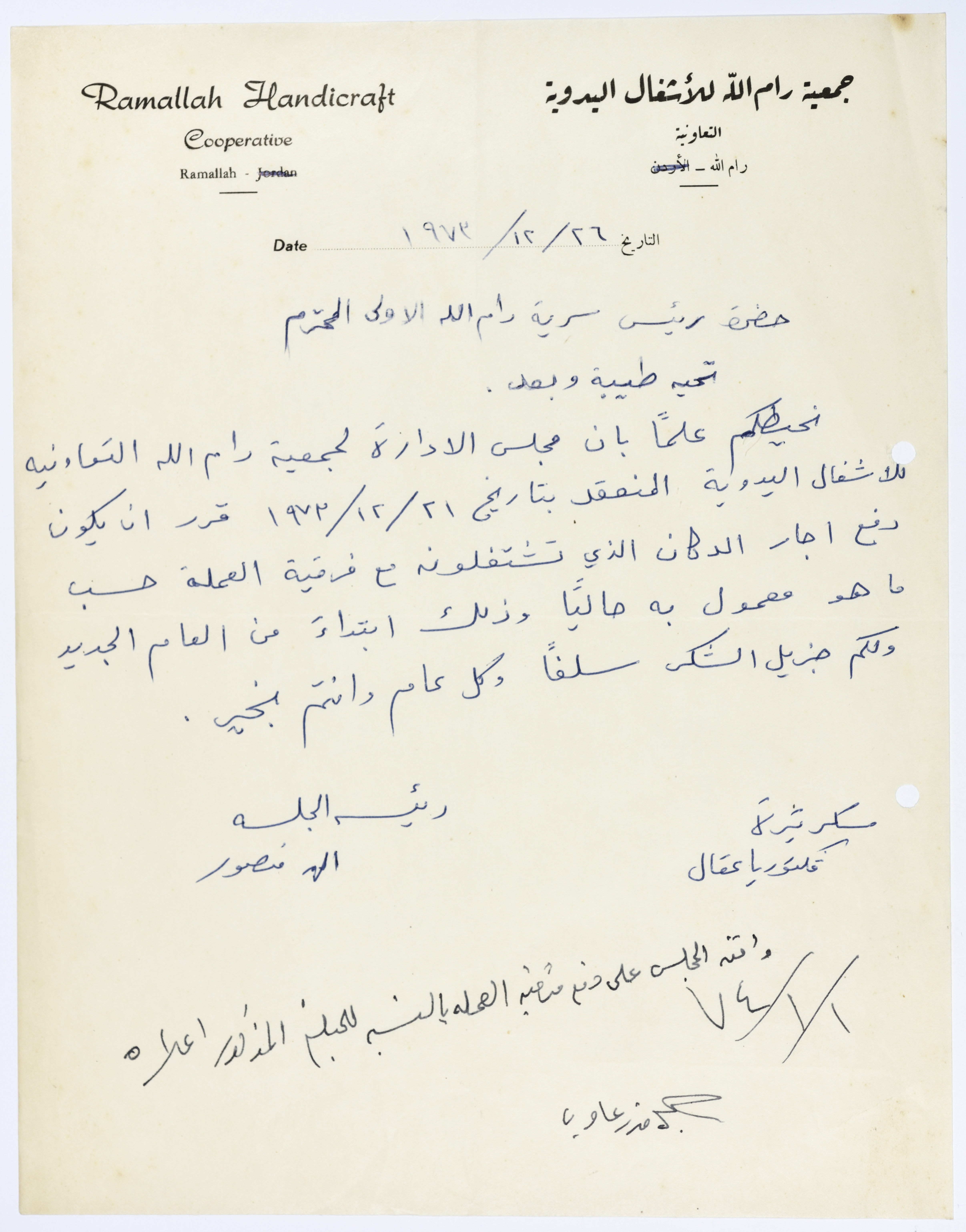 A Letter from Ramallah Handicraft Cooperative to Sareyyet Ramallah-First Ramallah Group (FRG) on the Rent of a Shop
