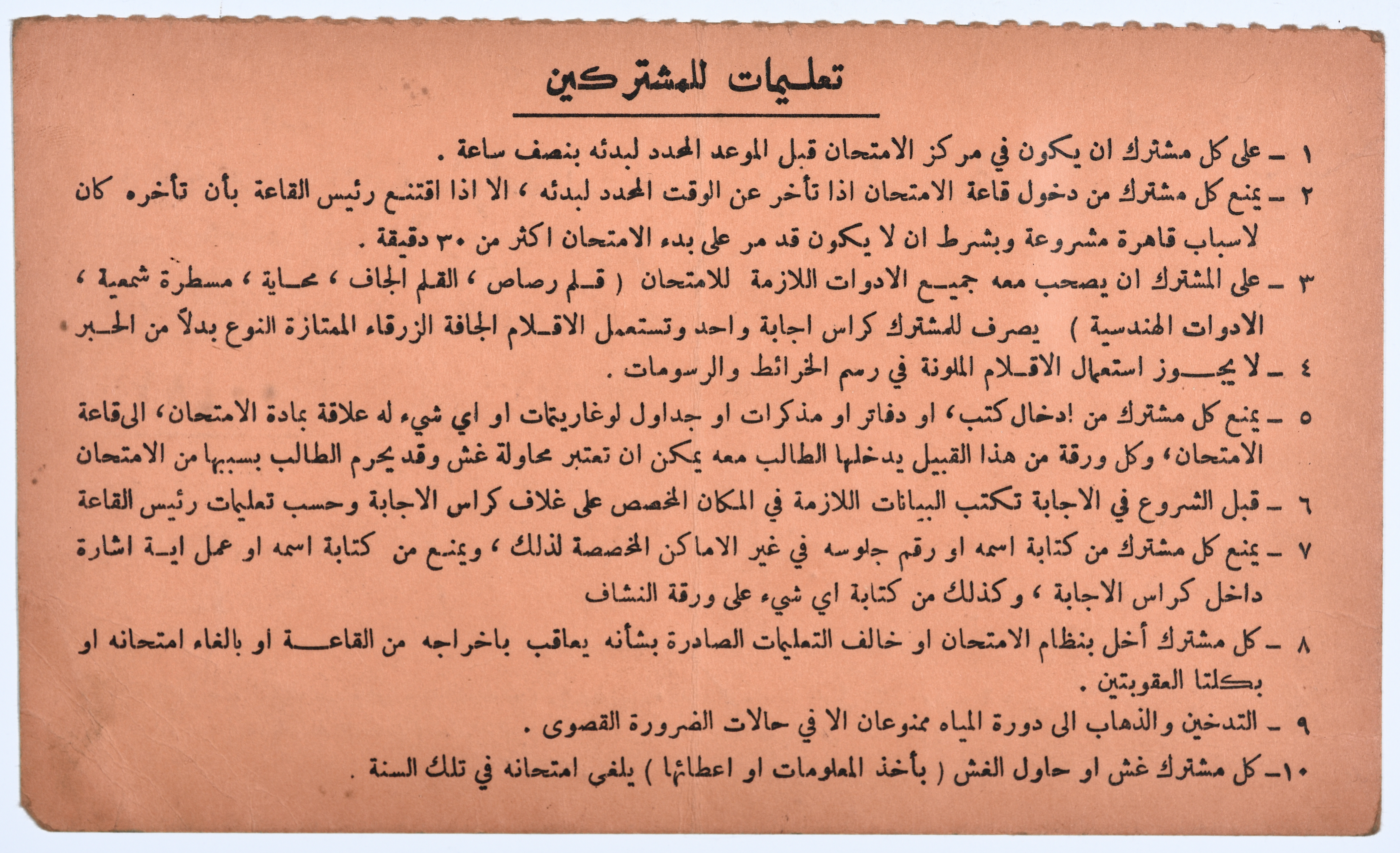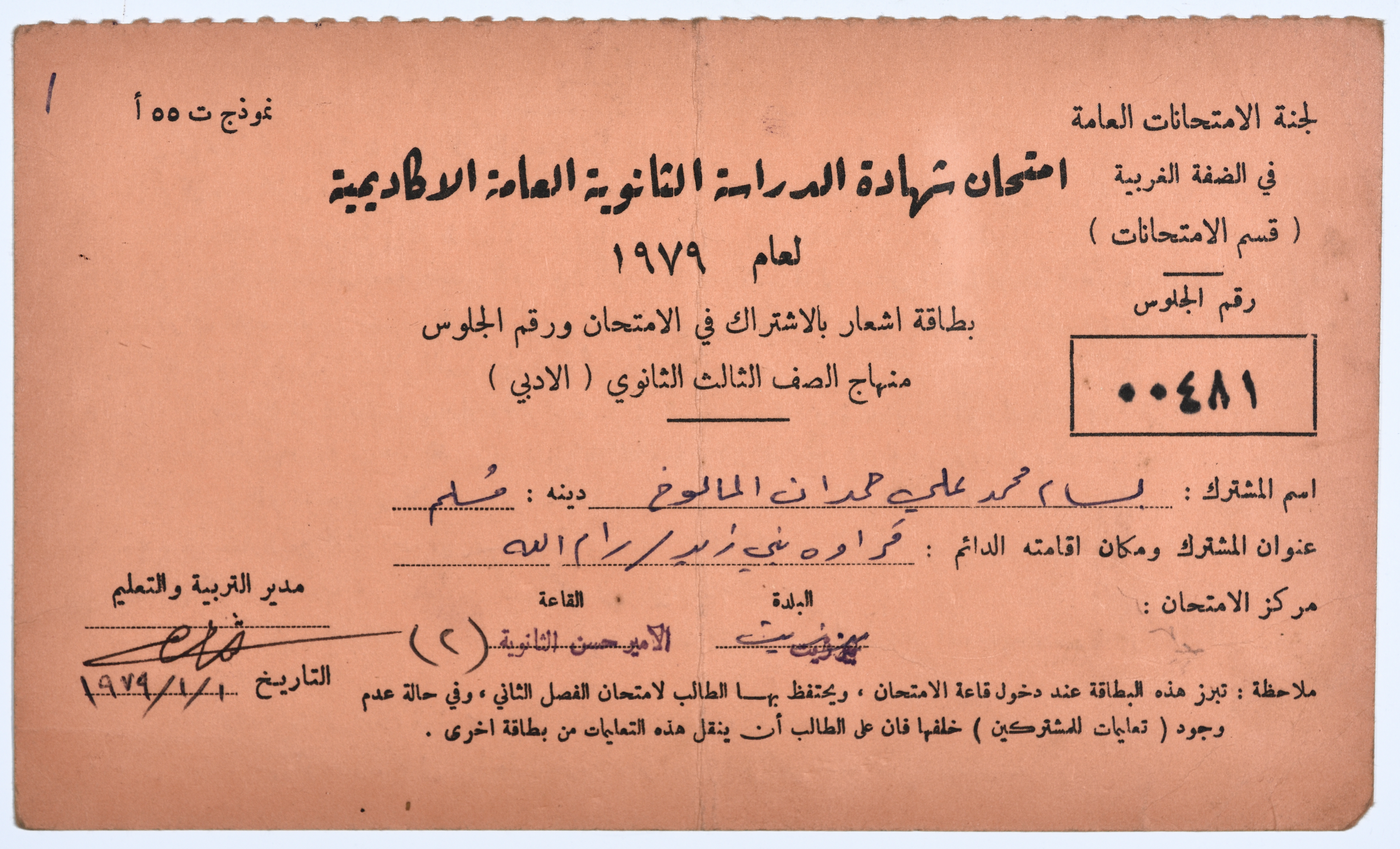 وثيقة تتضمن بطاقة التسجيل لامتحان الثانوية العامة في عام 1979، صدرت الوثيقة باسم بسام محمد علي المالوخ، فيها مكان اقامتها ومركز الامتحان وقاعة الامتحان.