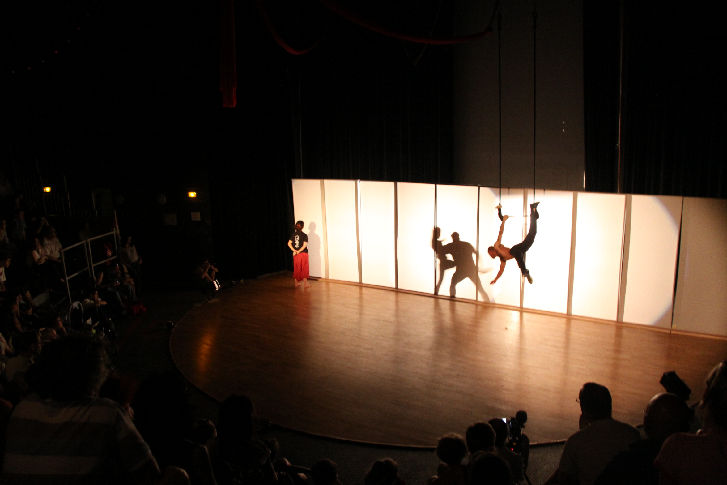 صورة ملونة من عرض "سيرك من خلف الجدار" الذي قدمته "مدرسة سيرك فلسطين" في مدينة تولوز في فرنسا، و يجسد عرض "سيرك من خلف الجدار" الحياة الواقعية للفلسطينيين: فصلهم عن عائلاتهم وأحبائهم وأرضهم ومائهم بواسطة جدار.