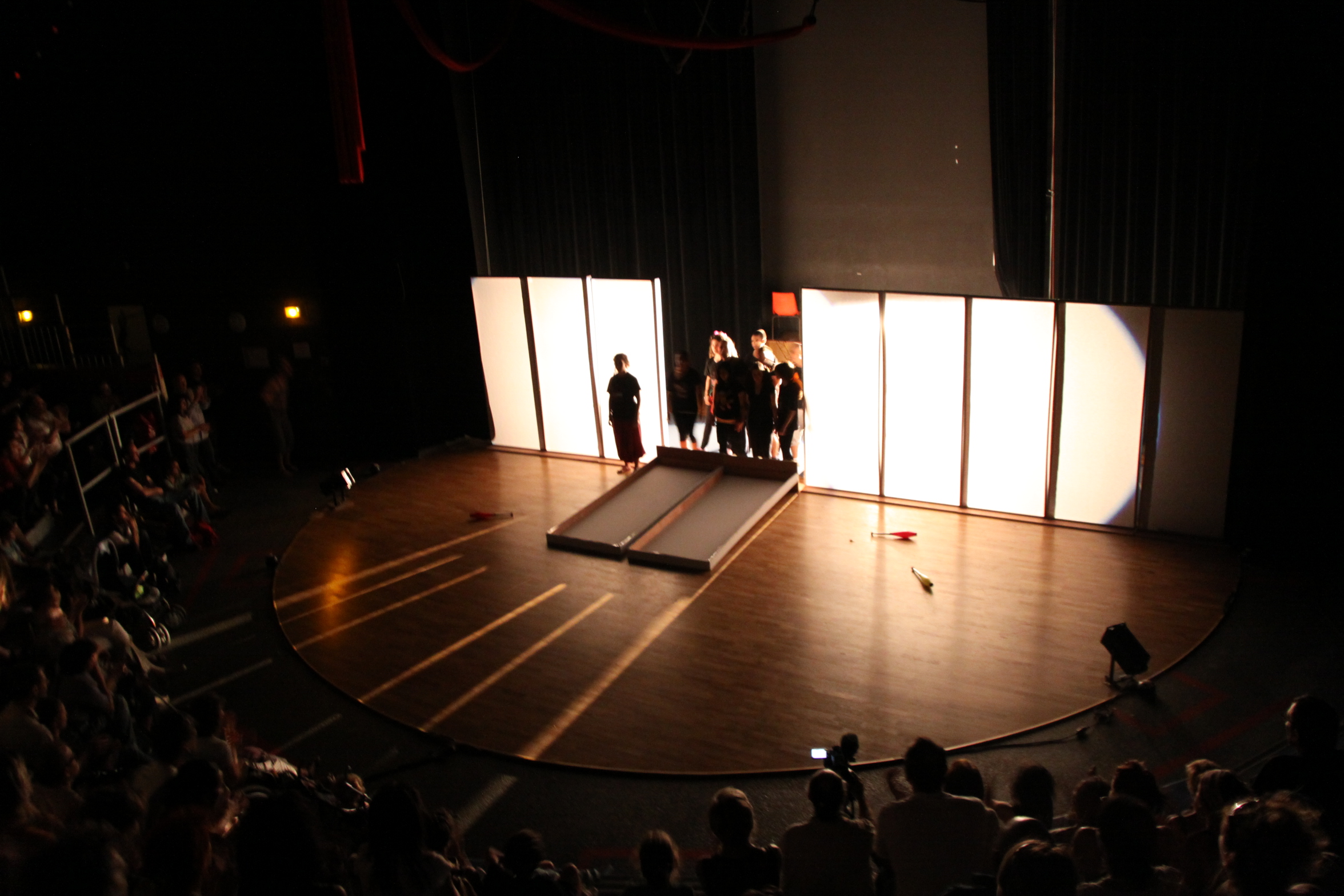 صورة ملونة من عرض "سيرك من خلف الجدار" الذي قدمته "مدرسة سيرك فلسطين" في مدينة تولوز في فرنسا، و يجسد عرض "سيرك من خلف الجدار" الحياة الواقعية للفلسطينيين: فصلهم عن عائلاتهم وأحبائهم وأرضهم ومائهم بواسطة جدار.