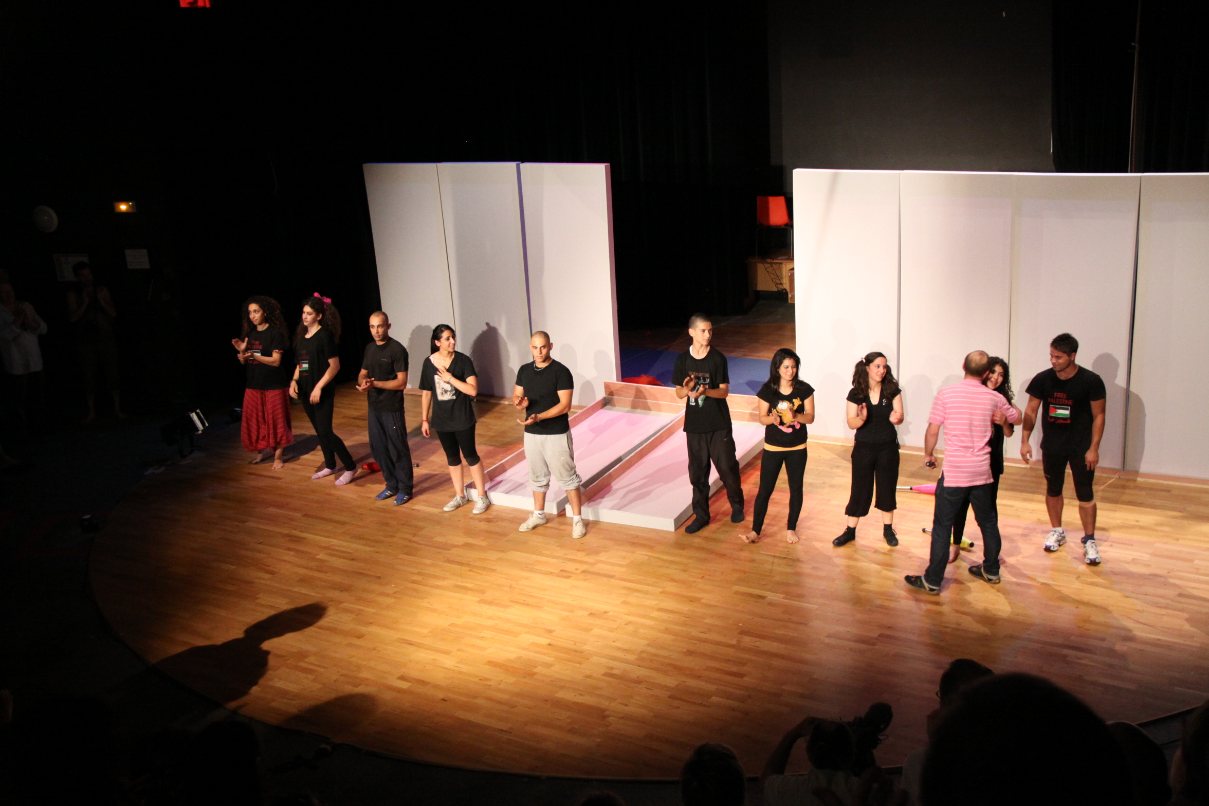 صورة ملونة من عرض "سيرك من خلف الجدار" الذي قدمته "مدرسة سيرك فلسطين" في مدينة تولوز في فرنسا، و يجسد عرض "سيرك من خلف الجدار" الحياة الواقعية للفلسطينيين: فصلهم عن عائلاتهم وأحبائهم وأرضهم ومائهم بواسطة جدار.