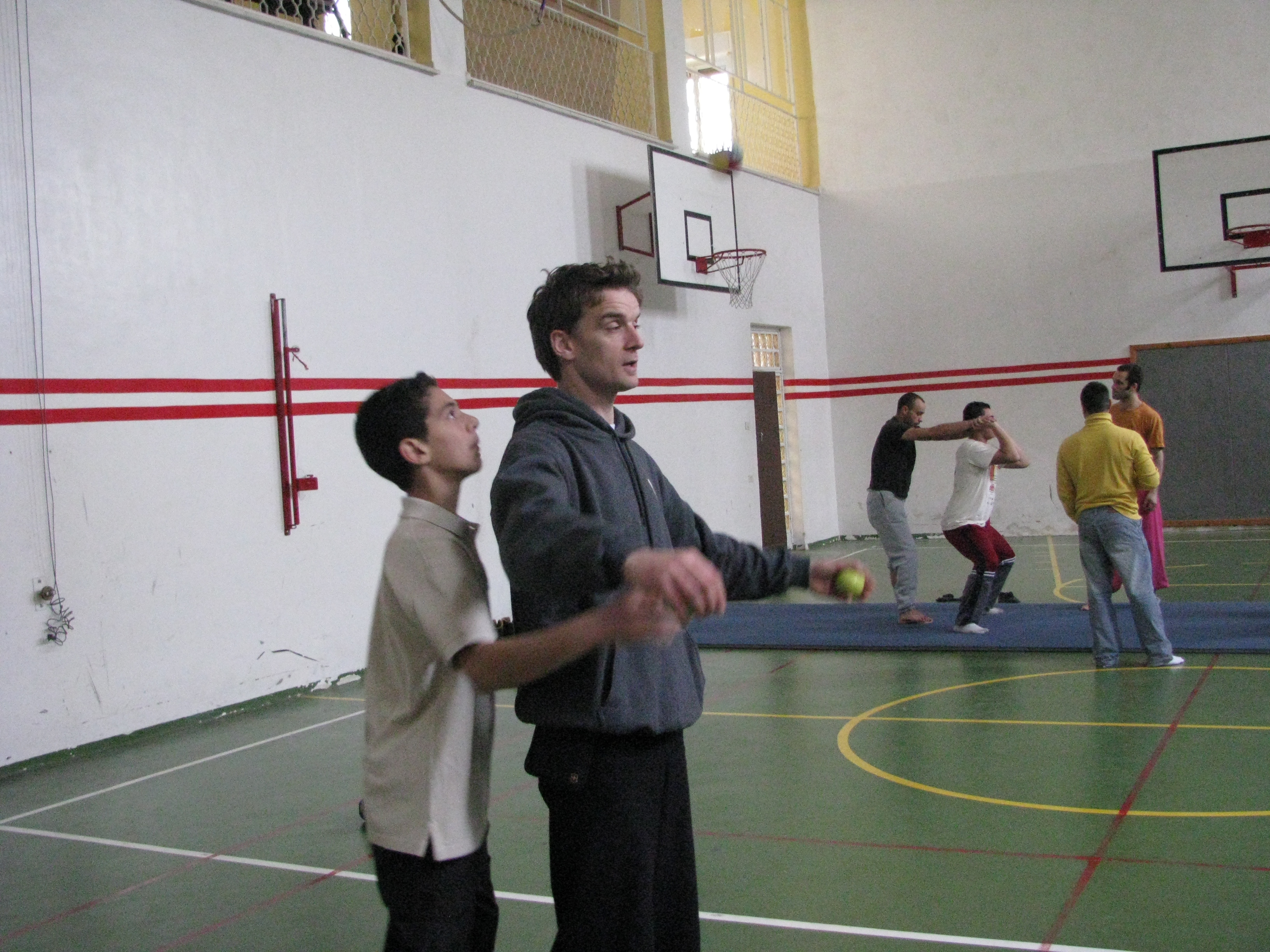 A colour photograph of a performance by an Irish team in coordination with the Palestinian Circus School.