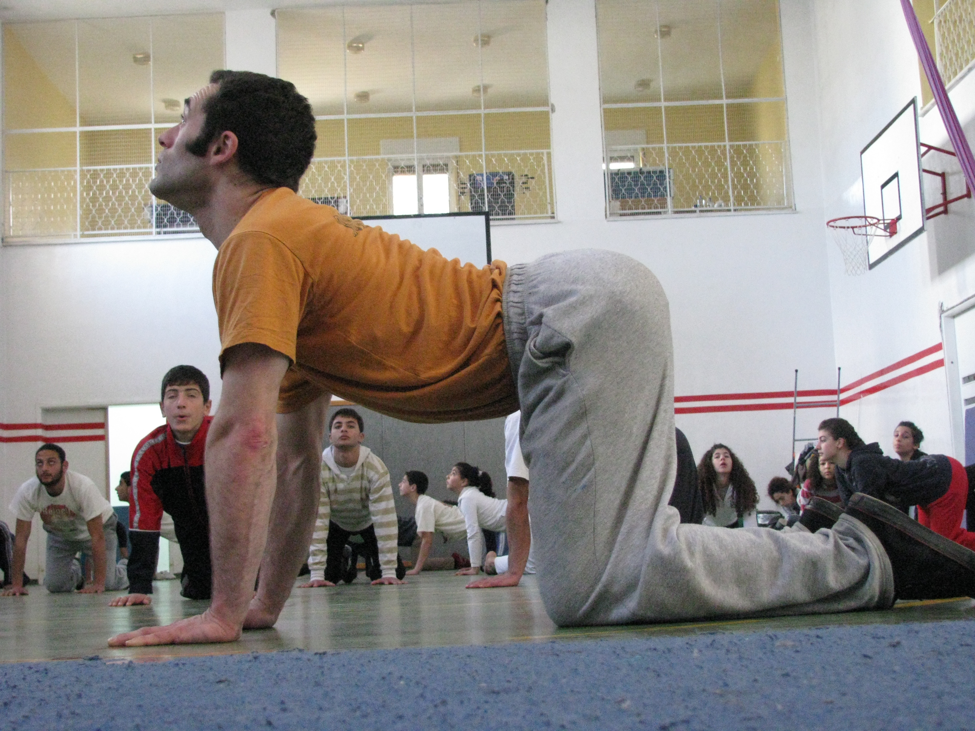 A colour photograph of a performance by an Irish team in coordination with the Palestinian Circus School.