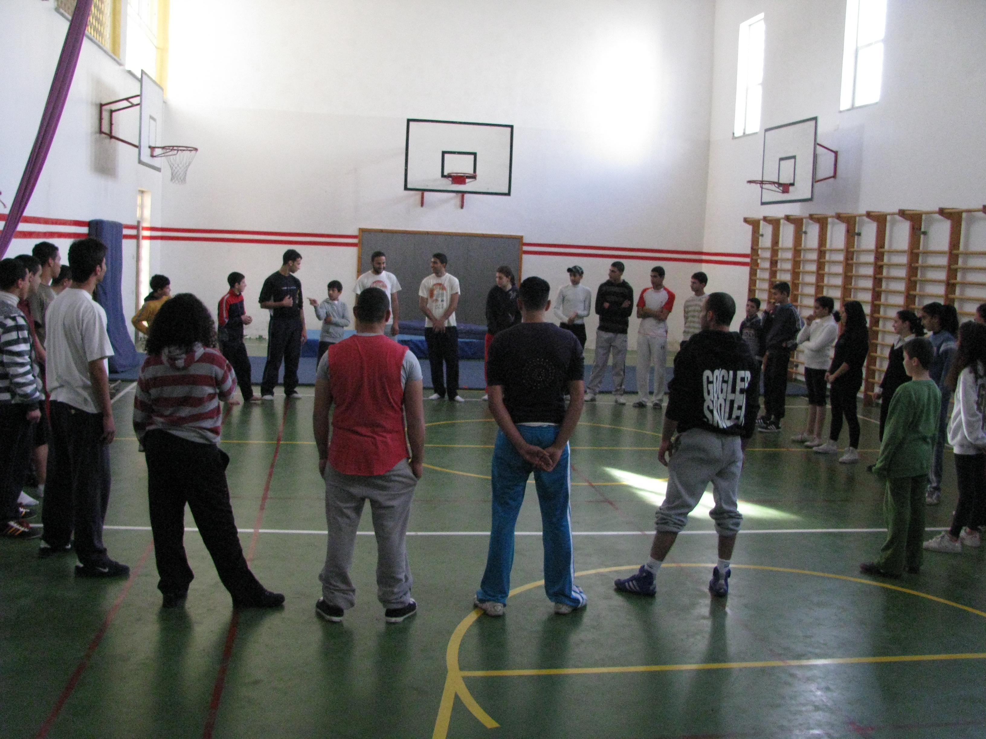 A colour photograph of a performance by an Irish team in coordination with the Palestinian Circus School.