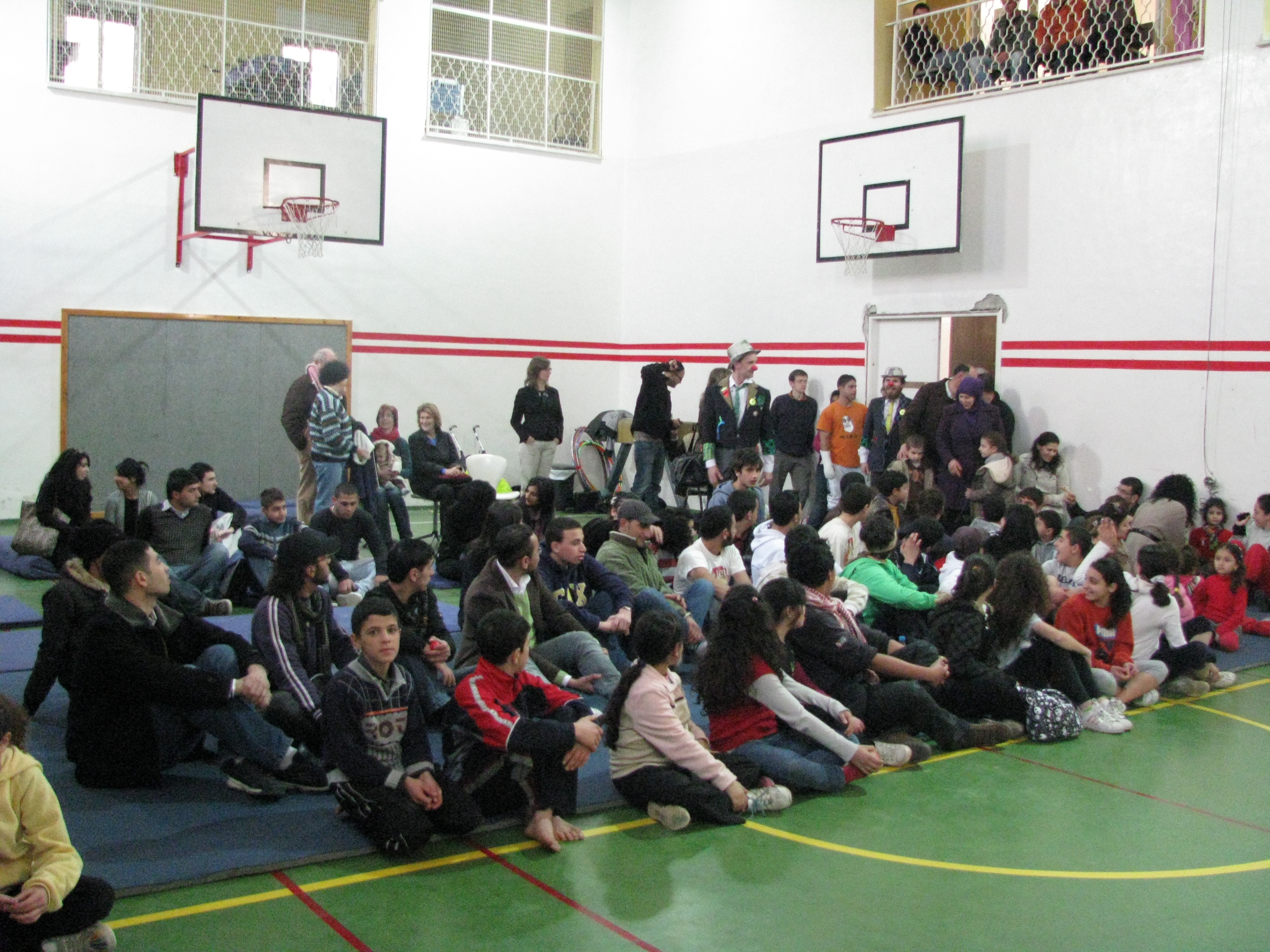A colour photograph of a performance by an Irish team in coordination with the Palestinian Circus School.