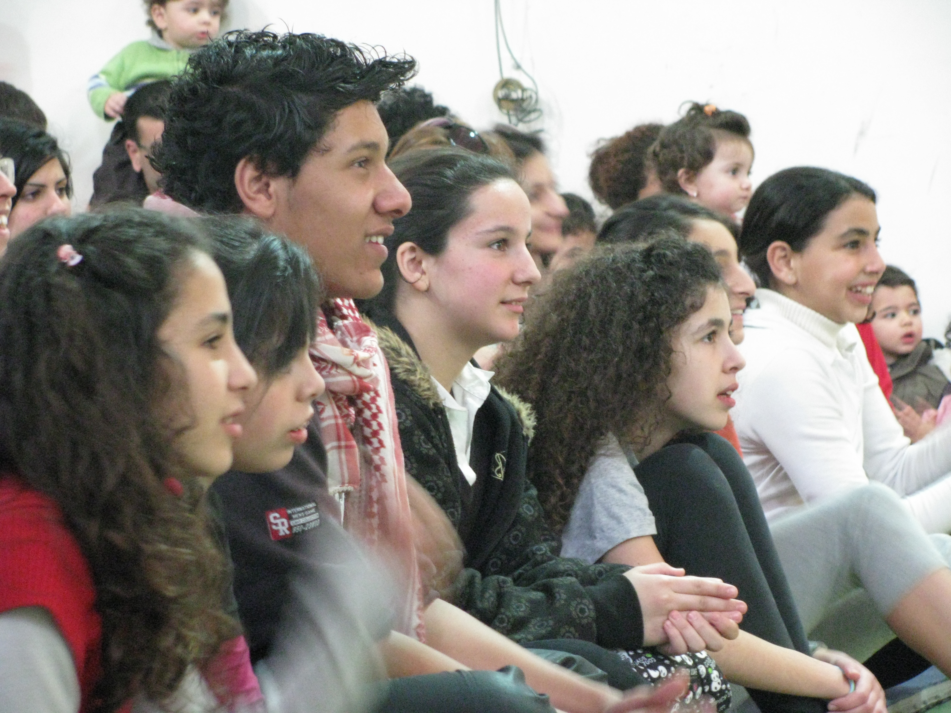 A colour photograph of a performance by an Irish team in coordination with the Palestinian Circus School.