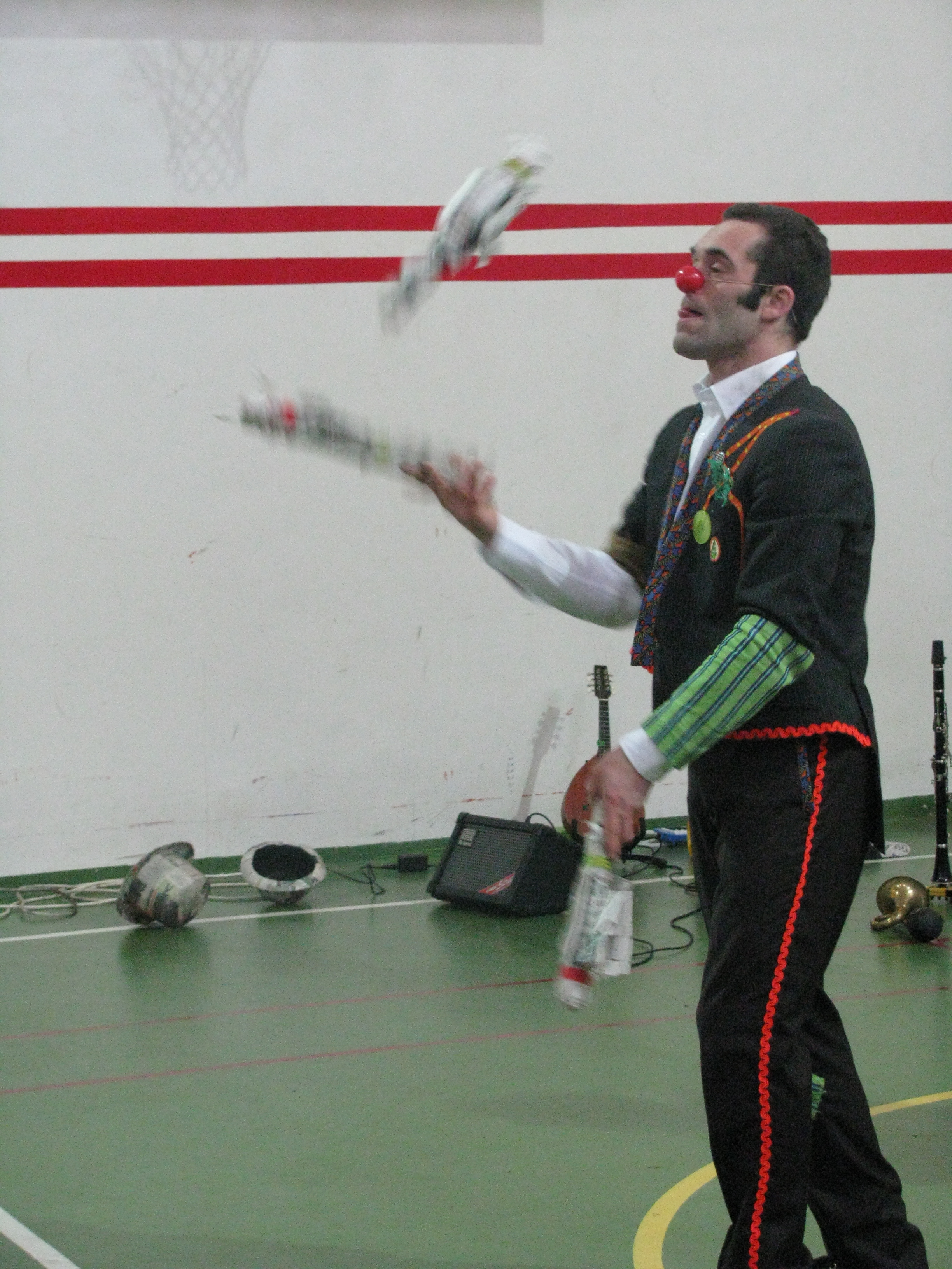 A colour photograph of a performance by an Irish team in coordination with the Palestinian Circus School.