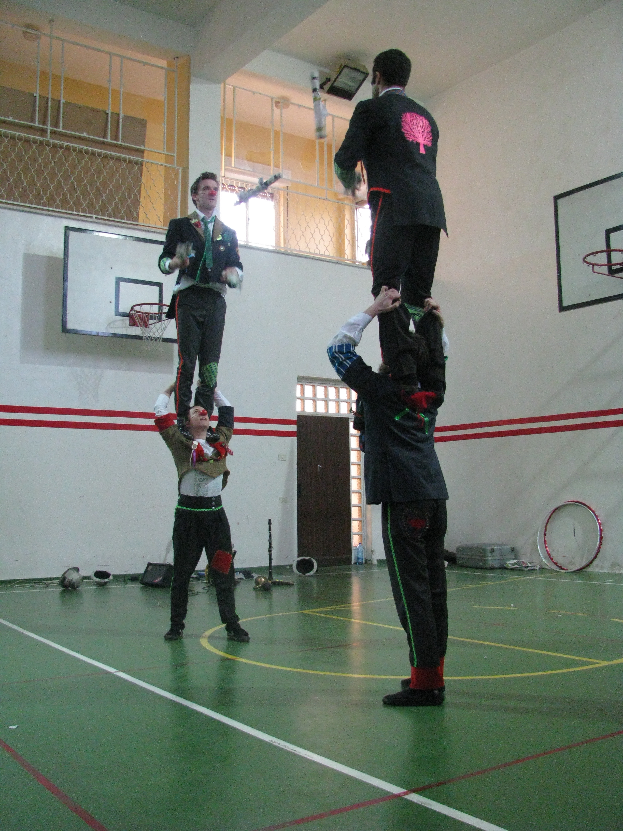 A colour photograph of a performance by an Irish team in coordination with the Palestinian Circus School.