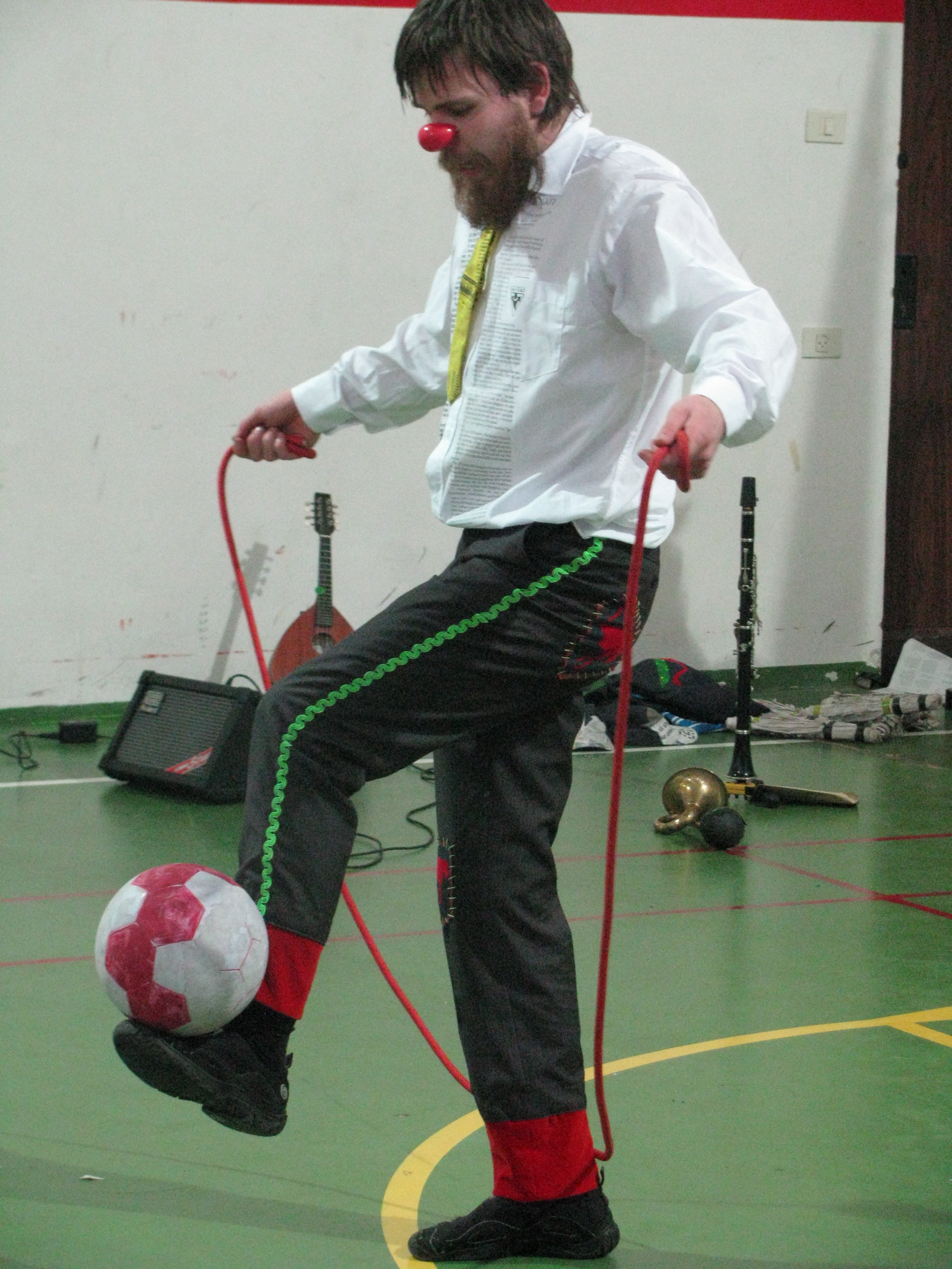 A colour photograph of a performance by an Irish team in coordination with the Palestinian Circus School.
