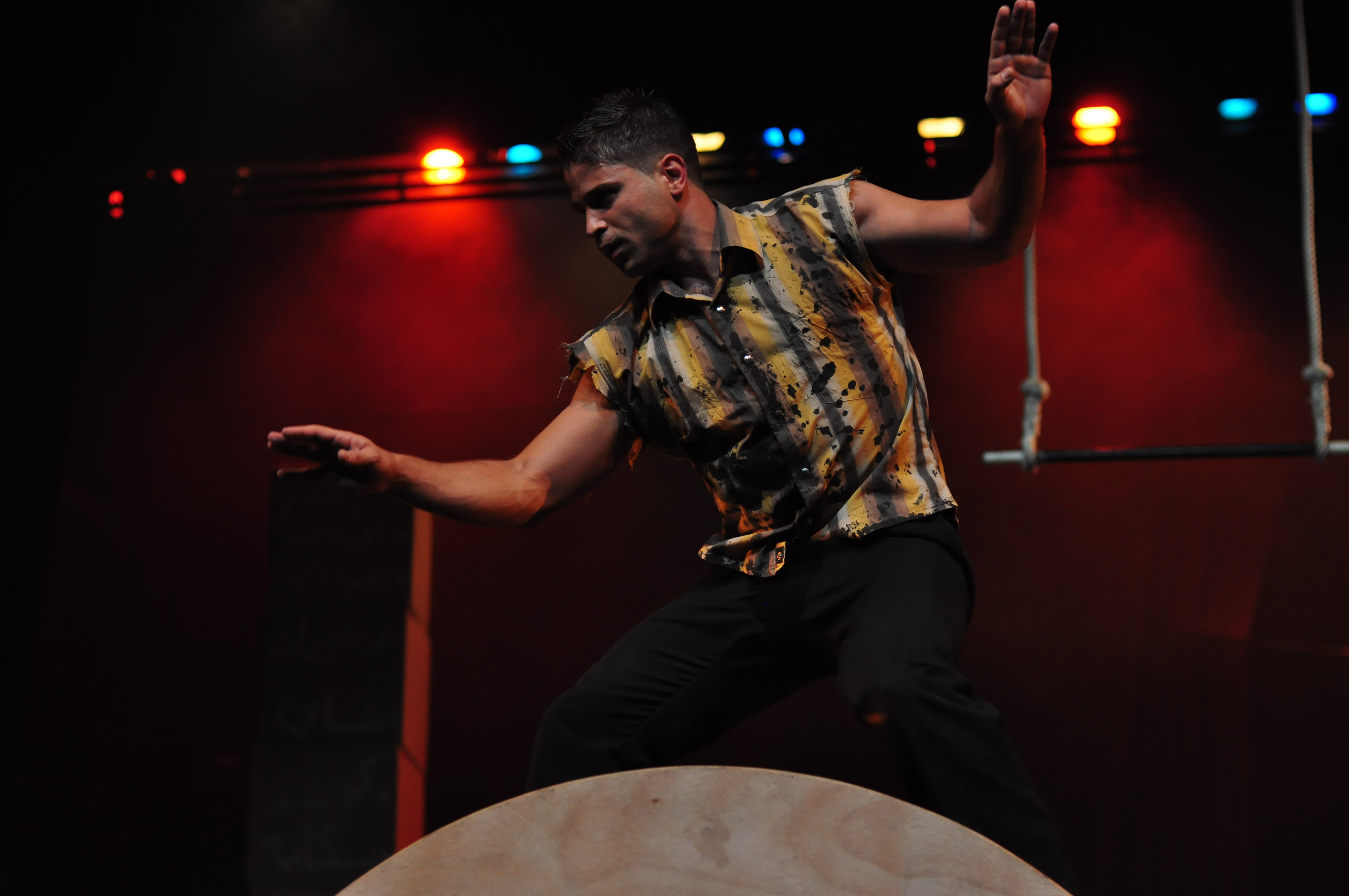 صورة ملونة من عرض "لوين" الذي قدمته "مدرسة سيرك فلسطين" و"لوين" هو الإنتاج الثاني لمدرسة سيرك فلسطين.