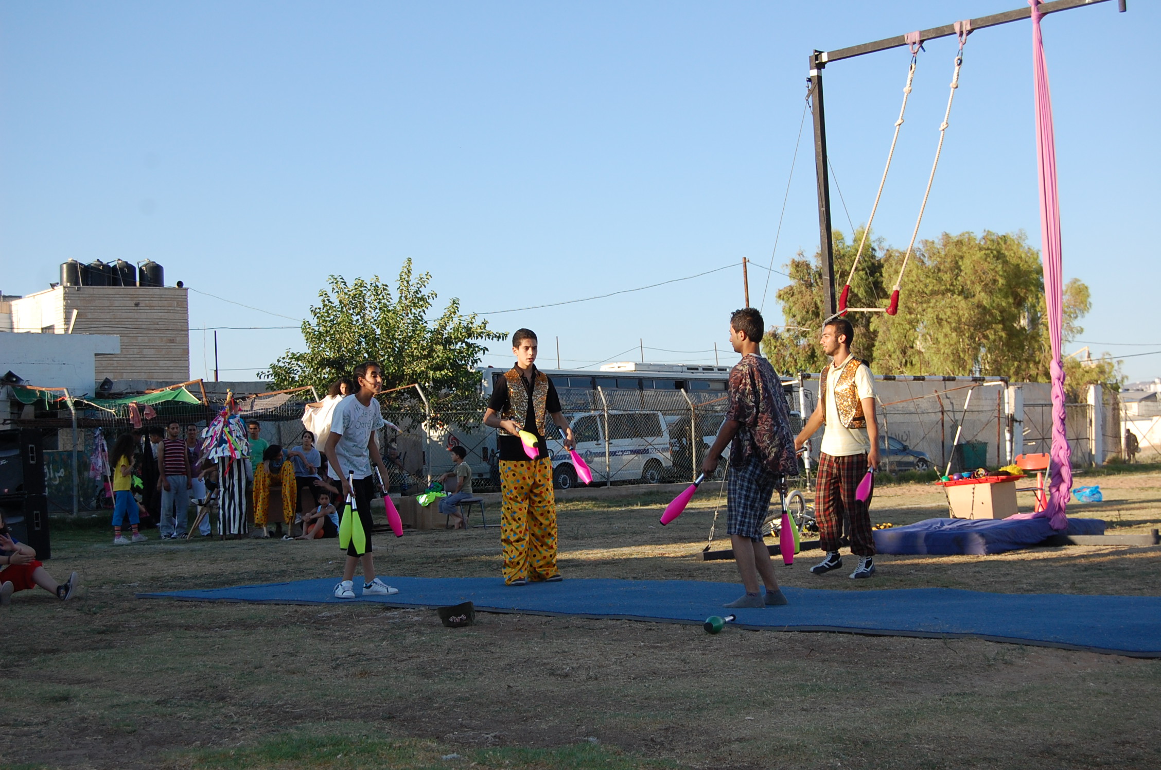 A colour photograph of the Palestine Circus School's production, "The Mobile Circus" in the Israeli-occupied city of Jenin in 2010. With a suite of training courses for all sections of society, the show featured a cast including, Ahmad Taleb, Alaʾ abu ar-Rub, Fady Zumurud, Hazar Azza, Laur Ṣadeq, Marah Ashmar, Mayrouby Makhluq, Muhammad abu ar-Rub, Muhammad abu Kishek, Muhammad abu Taleb, Muhammad al-Azza, Muhammad Ghayth, Muʿtaṣem Ghayth, and Yazan ʿWaydat.