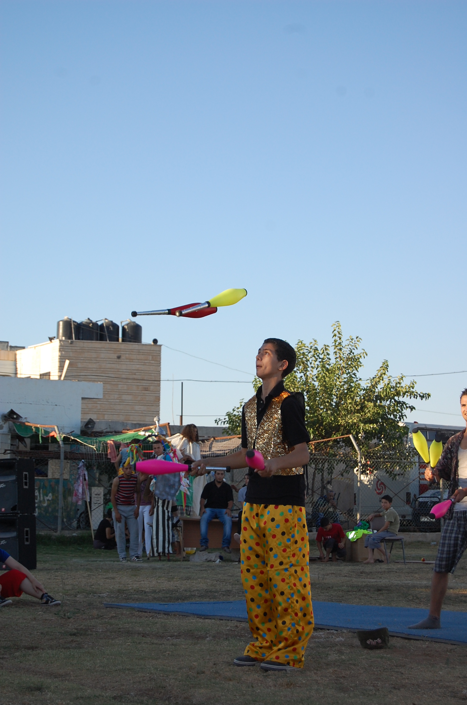 A colour photograph of the Palestine Circus School's production, "The Mobile Circus" in the Israeli-occupied city of Jenin in 2010. With a suite of training courses for all sections of society, the show featured a cast including, Ahmad Taleb, Alaʾ abu ar-Rub, Fady Zumurud, Hazar Azza, Laur Ṣadeq, Marah Ashmar, Mayrouby Makhluq, Muhammad abu ar-Rub, Muhammad abu Kishek, Muhammad abu Taleb, Muhammad al-Azza, Muhammad Ghayth, Muʿtaṣem Ghayth, and Yazan ʿWaydat.