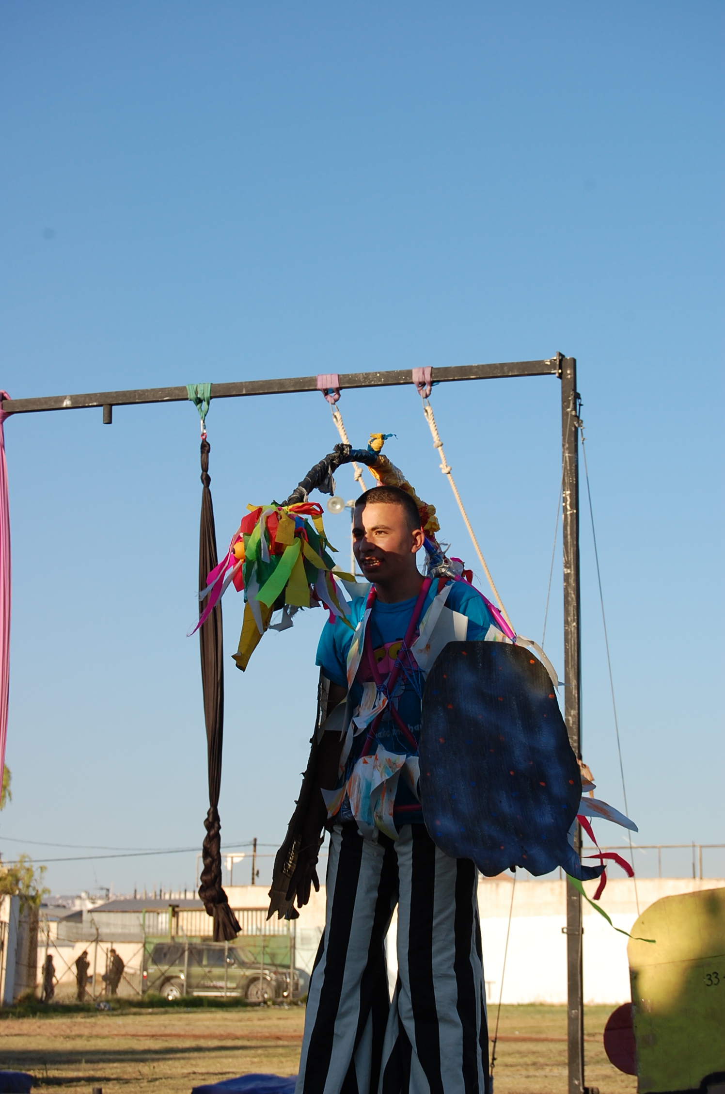 A colour photograph of the Palestine Circus School's production, "The Mobile Circus" in the Israeli-occupied city of Jenin in 2010. With a suite of training courses for all sections of society, the show featured a cast including, Ahmad Taleb, Alaʾ abu ar-Rub, Fady Zumurud, Hazar Azza, Laur Ṣadeq, Marah Ashmar, Mayrouby Makhluq, Muhammad abu ar-Rub, Muhammad abu Kishek, Muhammad abu Taleb, Muhammad al-Azza, Muhammad Ghayth, Muʿtaṣem Ghayth, and Yazan ʿWaydat.