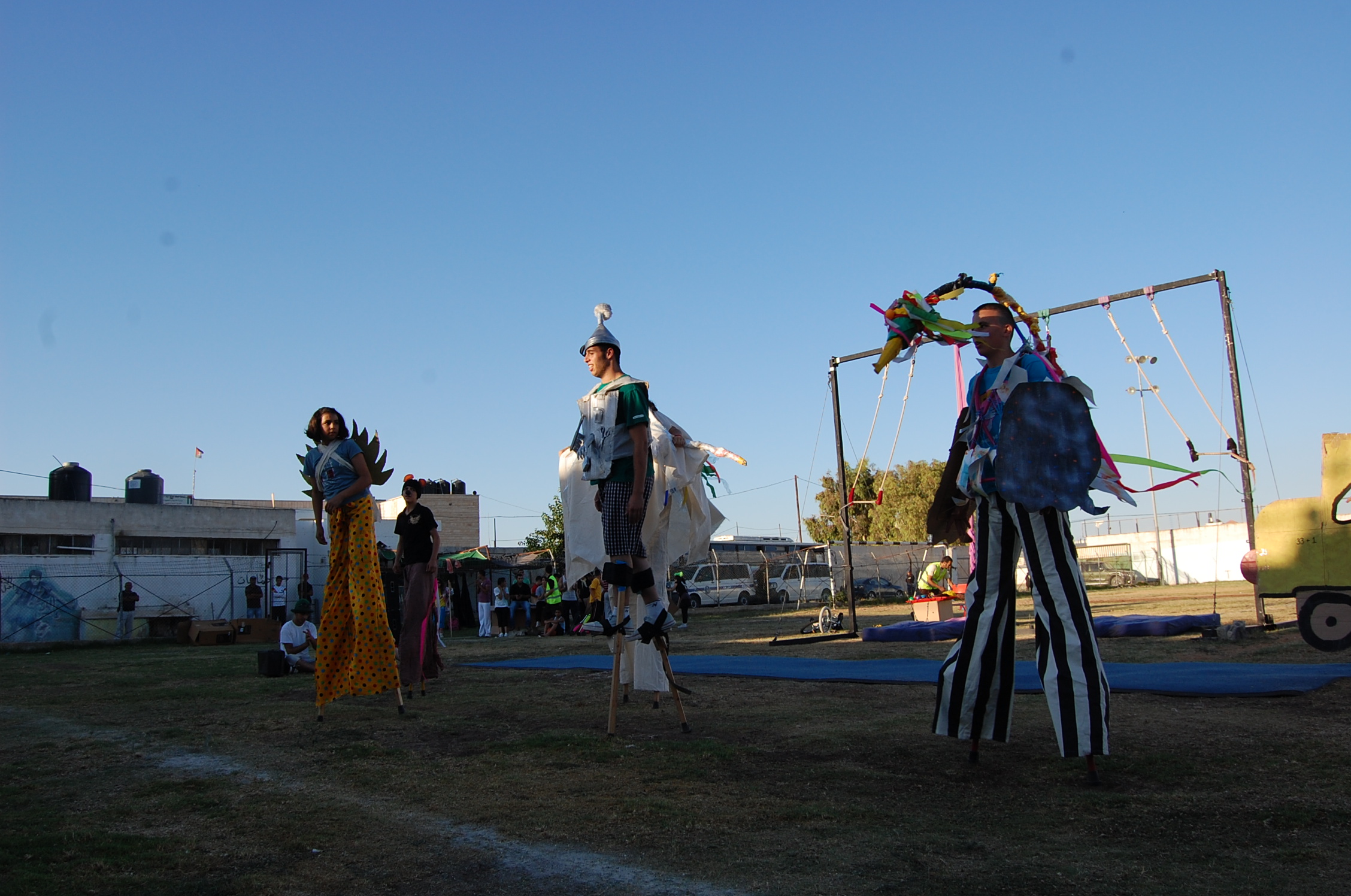 A colour photograph of the Palestine Circus School's production, "The Mobile Circus" in the Israeli-occupied city of Jenin in 2010. With a suite of training courses for all sections of society, the show featured a cast including, Ahmad Taleb, Alaʾ abu ar-Rub, Fady Zumurud, Hazar Azza, Laur Ṣadeq, Marah Ashmar, Mayrouby Makhluq, Muhammad abu ar-Rub, Muhammad abu Kishek, Muhammad abu Taleb, Muhammad al-Azza, Muhammad Ghayth, Muʿtaṣem Ghayth, and Yazan ʿWaydat.