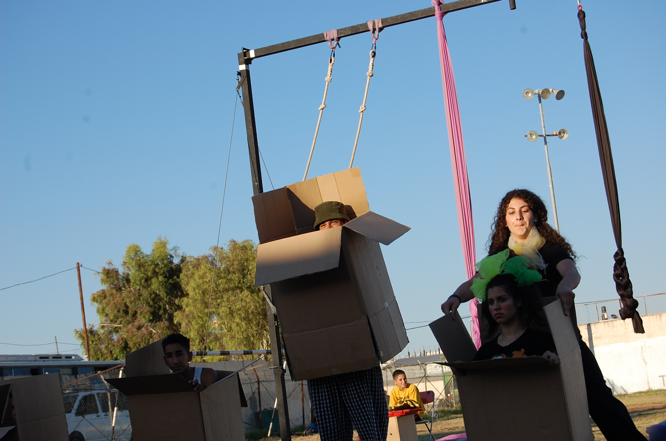 A colour photograph of the Palestine Circus School's production, "The Mobile Circus" in the Israeli-occupied city of Jenin in 2010. With a suite of training courses for all sections of society, the show featured a cast including, Ahmad Taleb, Alaʾ abu ar-Rub, Fady Zumurud, Hazar Azza, Laur Ṣadeq, Marah Ashmar, Mayrouby Makhluq, Muhammad abu ar-Rub, Muhammad abu Kishek, Muhammad abu Taleb, Muhammad al-Azza, Muhammad Ghayth, Muʿtaṣem Ghayth, and Yazan ʿWaydat.