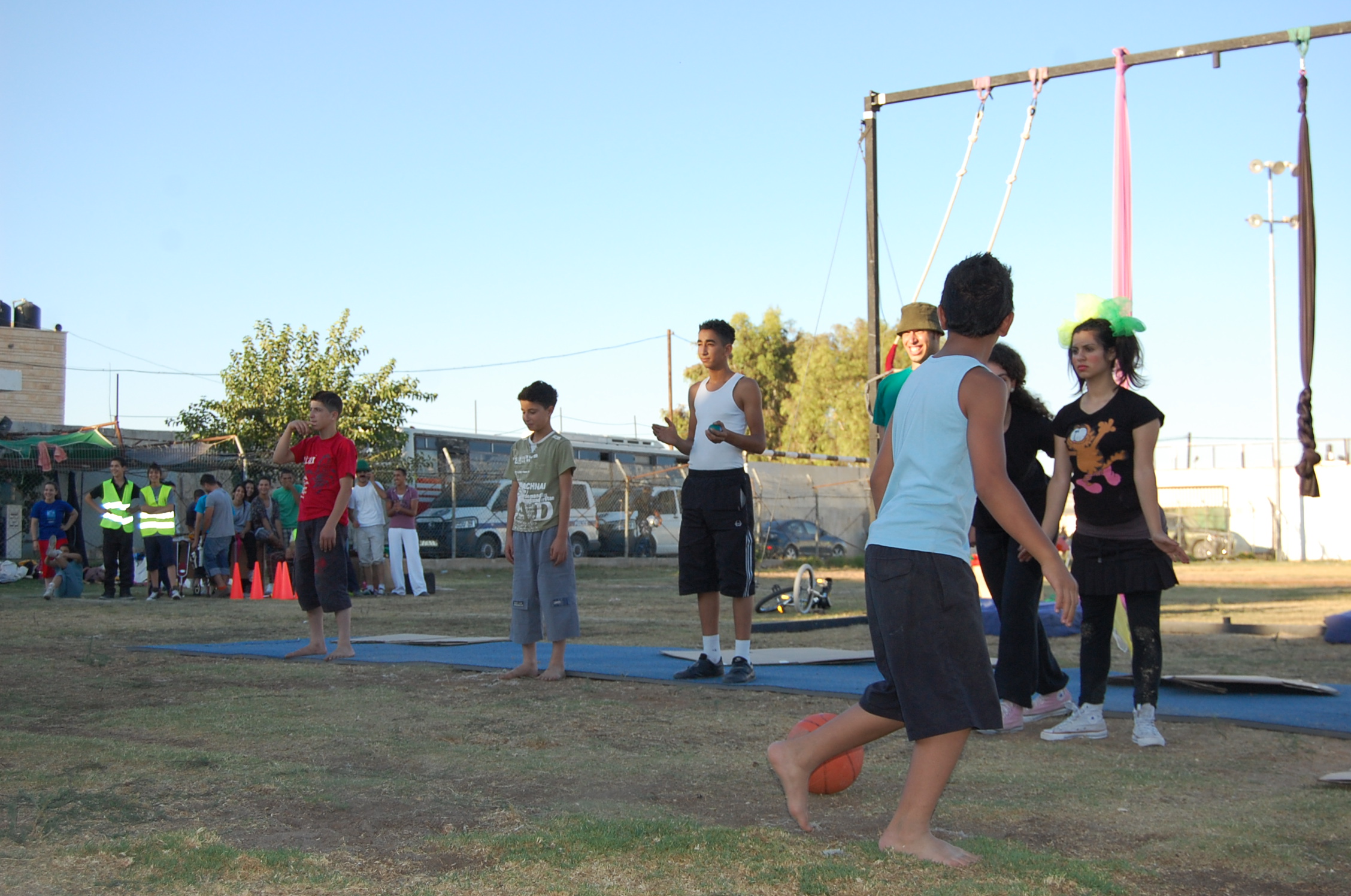 A colour photograph of the Palestine Circus School's production, "The Mobile Circus" in the Israeli-occupied city of Jenin in 2010. With a suite of training courses for all sections of society, the show featured a cast including, Ahmad Taleb, Alaʾ abu ar-Rub, Fady Zumurud, Hazar Azza, Laur Ṣadeq, Marah Ashmar, Mayrouby Makhluq, Muhammad abu ar-Rub, Muhammad abu Kishek, Muhammad abu Taleb, Muhammad al-Azza, Muhammad Ghayth, Muʿtaṣem Ghayth, and Yazan ʿWaydat.