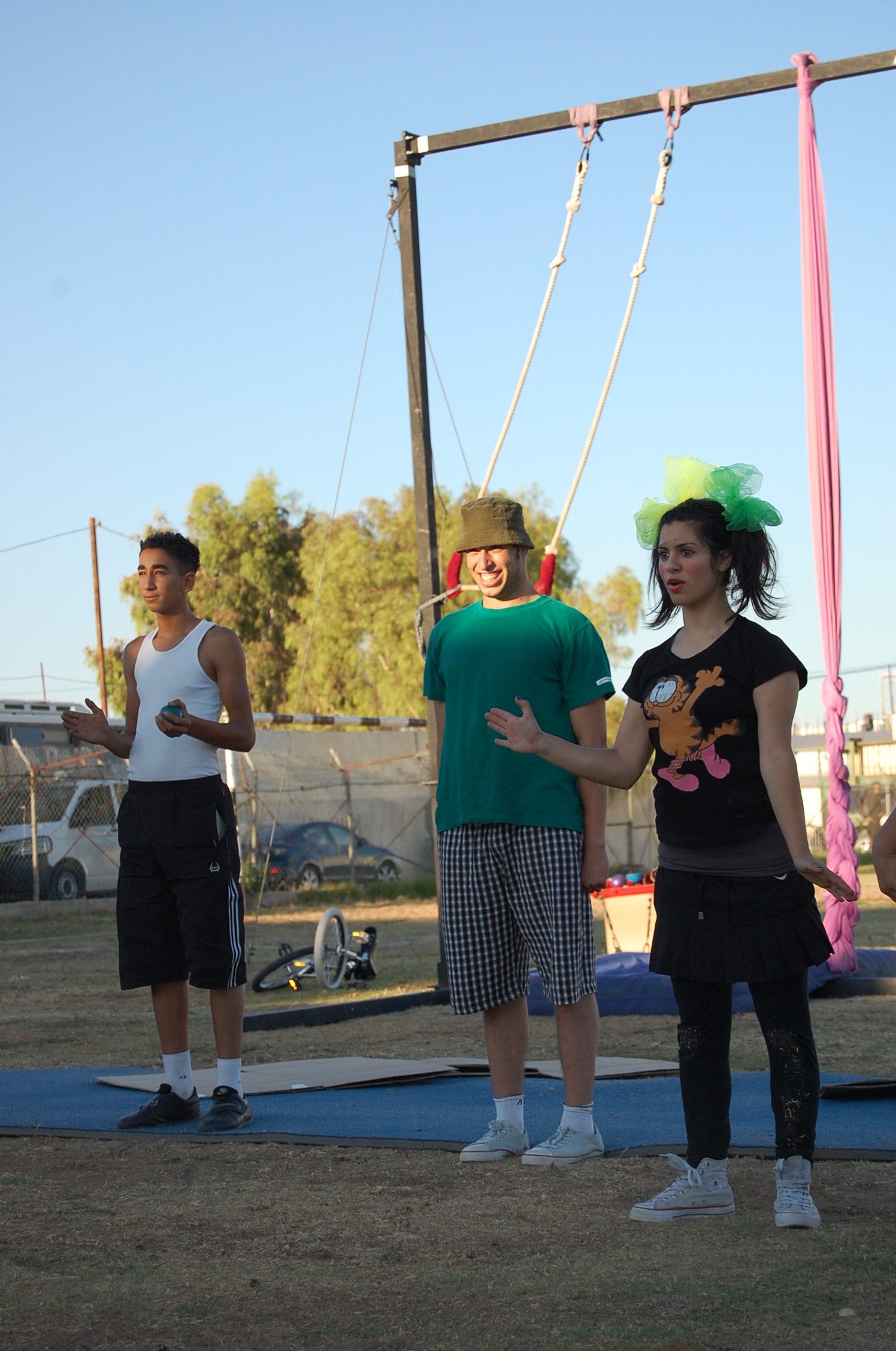 A colour photograph of the Palestine Circus School's production, "The Mobile Circus" in the Israeli-occupied city of Jenin in 2010. With a suite of training courses for all sections of society, the show featured a cast including, Ahmad Taleb, Alaʾ abu ar-Rub, Fady Zumurud, Hazar Azza, Laur Ṣadeq, Marah Ashmar, Mayrouby Makhluq, Muhammad abu ar-Rub, Muhammad abu Kishek, Muhammad abu Taleb, Muhammad al-Azza, Muhammad Ghayth, Muʿtaṣem Ghayth, and Yazan ʿWaydat.