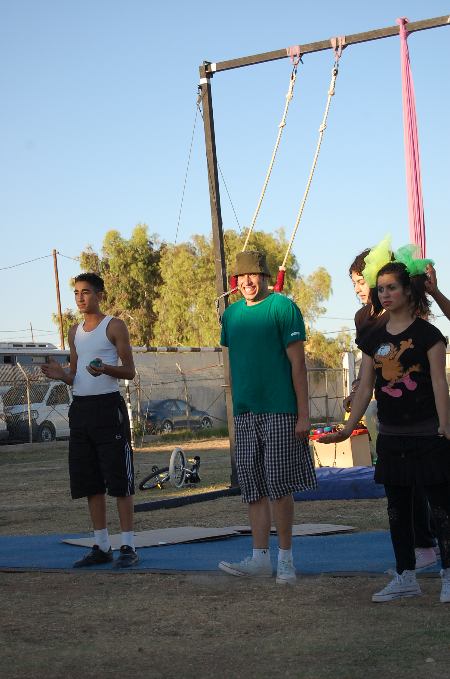 A colour photograph of the Palestine Circus School's production, "The Mobile Circus" in the Israeli-occupied city of Jenin in 2010. With a suite of training courses for all sections of society, the show featured a cast including, Ahmad Taleb, Alaʾ abu ar-Rub, Fady Zumurud, Hazar Azza, Laur Ṣadeq, Marah Ashmar, Mayrouby Makhluq, Muhammad abu ar-Rub, Muhammad abu Kishek, Muhammad abu Taleb, Muhammad al-Azza, Muhammad Ghayth, Muʿtaṣem Ghayth, and Yazan ʿWaydat.