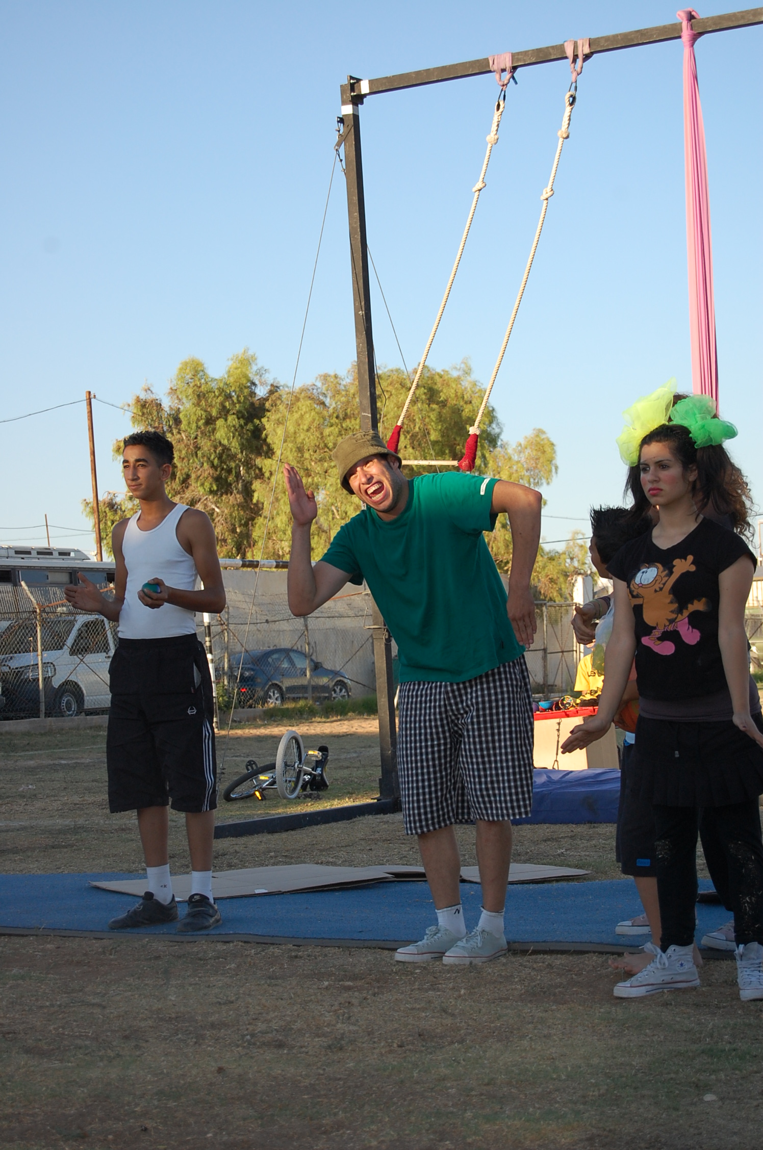 A colour photograph of the Palestine Circus School's production, "The Mobile Circus" in the Israeli-occupied city of Jenin in 2010. With a suite of training courses for all sections of society, the show featured a cast including, Ahmad Taleb, Alaʾ abu ar-Rub, Fady Zumurud, Hazar Azza, Laur Ṣadeq, Marah Ashmar, Mayrouby Makhluq, Muhammad abu ar-Rub, Muhammad abu Kishek, Muhammad abu Taleb, Muhammad al-Azza, Muhammad Ghayth, Muʿtaṣem Ghayth, and Yazan ʿWaydat.