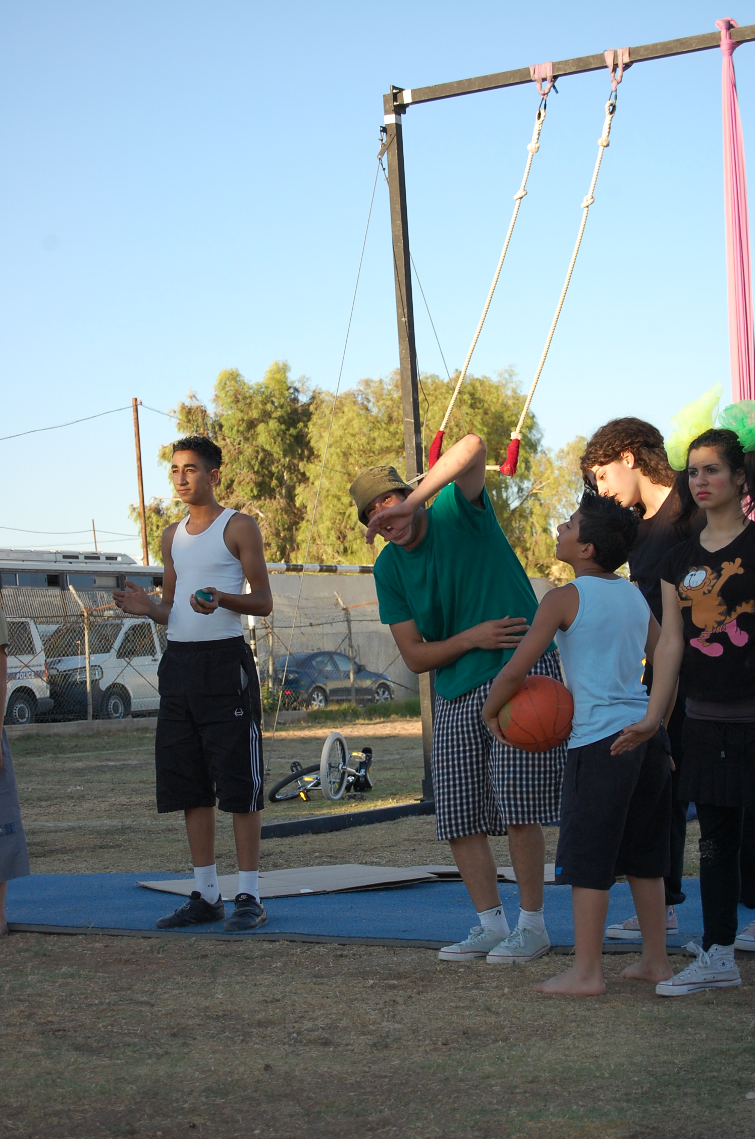 A colour photograph of the Palestine Circus School's production, "The Mobile Circus" in the Israeli-occupied city of Jenin in 2010. With a suite of training courses for all sections of society, the show featured a cast including, Ahmad Taleb, Alaʾ abu ar-Rub, Fady Zumurud, Hazar Azza, Laur Ṣadeq, Marah Ashmar, Mayrouby Makhluq, Muhammad abu ar-Rub, Muhammad abu Kishek, Muhammad abu Taleb, Muhammad al-Azza, Muhammad Ghayth, Muʿtaṣem Ghayth, and Yazan ʿWaydat.