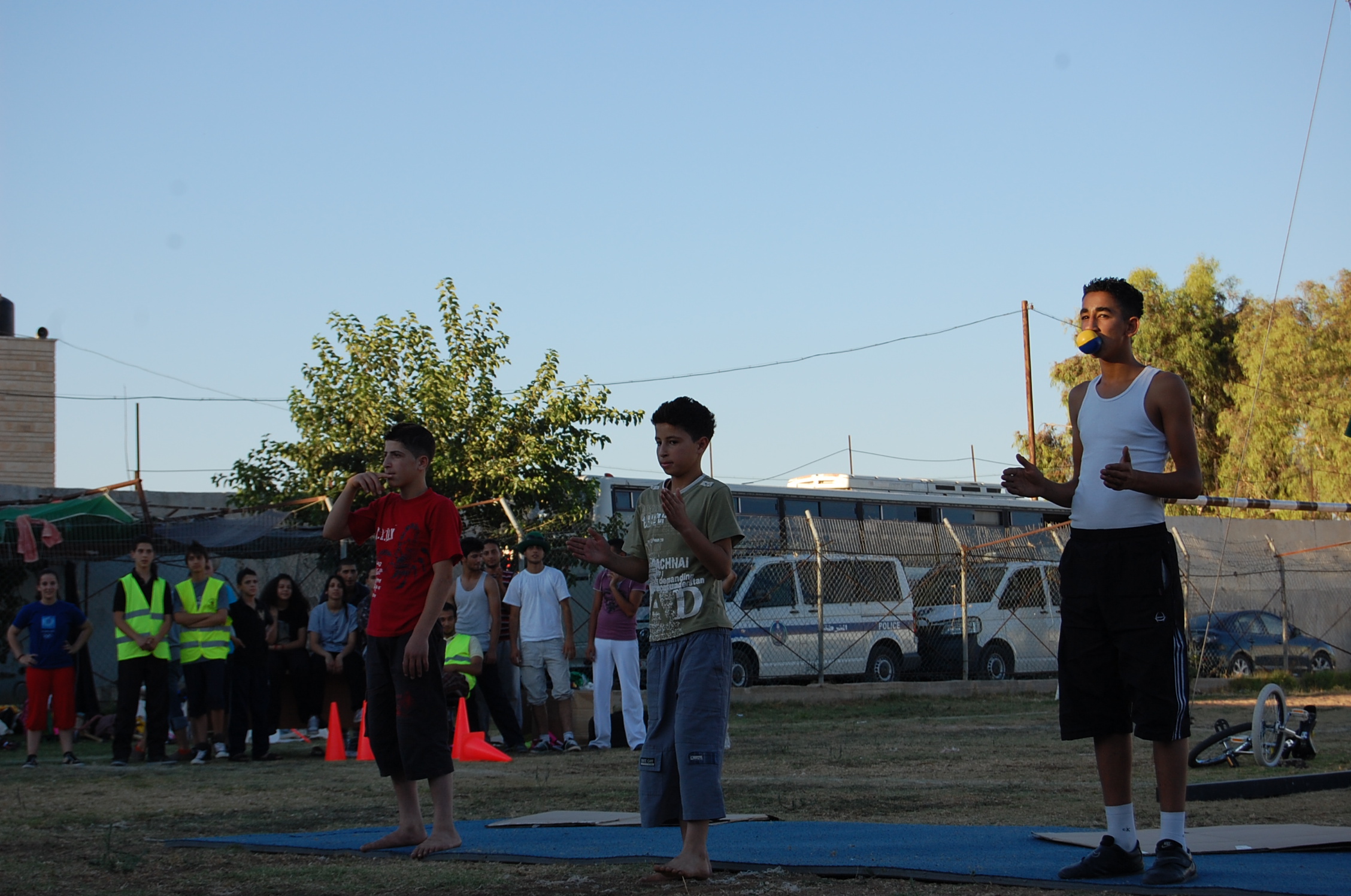 A colour photograph of the Palestine Circus School's production, "The Mobile Circus" in the Israeli-occupied city of Jenin in 2010. With a suite of training courses for all sections of society, the show featured a cast including, Ahmad Taleb, Alaʾ abu ar-Rub, Fady Zumurud, Hazar Azza, Laur Ṣadeq, Marah Ashmar, Mayrouby Makhluq, Muhammad abu ar-Rub, Muhammad abu Kishek, Muhammad abu Taleb, Muhammad al-Azza, Muhammad Ghayth, Muʿtaṣem Ghayth, and Yazan ʿWaydat.
