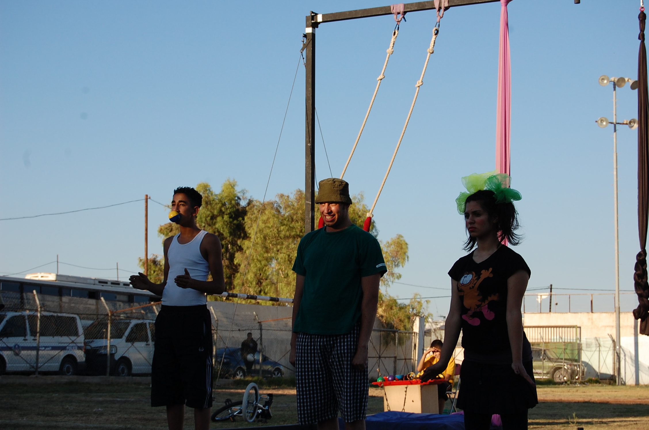 A colour photograph of the Palestine Circus School's production, "The Mobile Circus" in the Israeli-occupied city of Jenin in 2010. With a suite of training courses for all sections of society, the show featured a cast including, Ahmad Taleb, Alaʾ abu ar-Rub, Fady Zumurud, Hazar Azza, Laur Ṣadeq, Marah Ashmar, Mayrouby Makhluq, Muhammad abu ar-Rub, Muhammad abu Kishek, Muhammad abu Taleb, Muhammad al-Azza, Muhammad Ghayth, Muʿtaṣem Ghayth, and Yazan ʿWaydat.