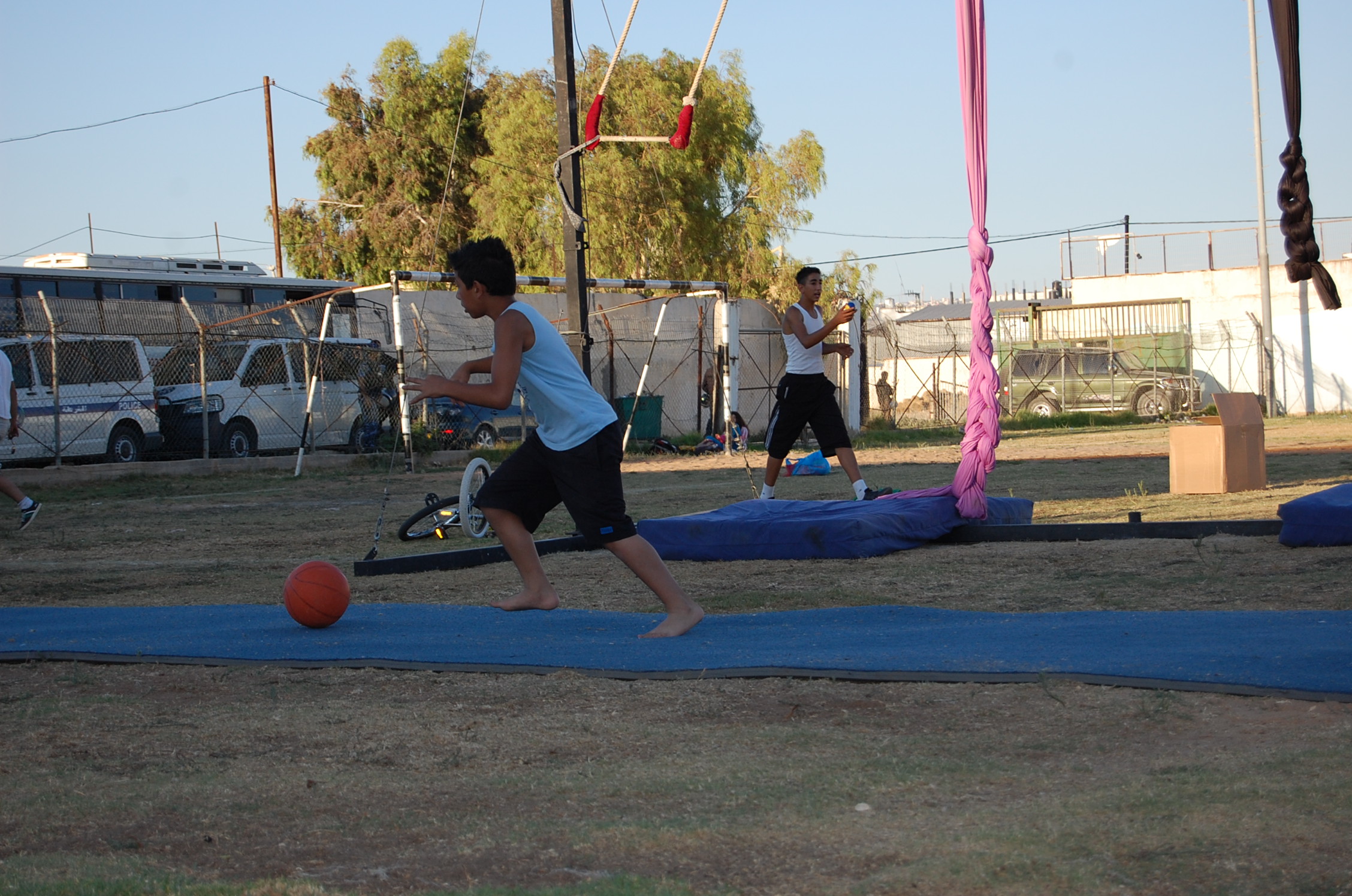 A colour photograph of the Palestine Circus School's production, "The Mobile Circus" in the Israeli-occupied city of Jenin in 2010. With a suite of training courses for all sections of society, the show featured a cast including, Ahmad Taleb, Alaʾ abu ar-Rub, Fady Zumurud, Hazar Azza, Laur Ṣadeq, Marah Ashmar, Mayrouby Makhluq, Muhammad abu ar-Rub, Muhammad abu Kishek, Muhammad abu Taleb, Muhammad al-Azza, Muhammad Ghayth, Muʿtaṣem Ghayth, and Yazan ʿWaydat.