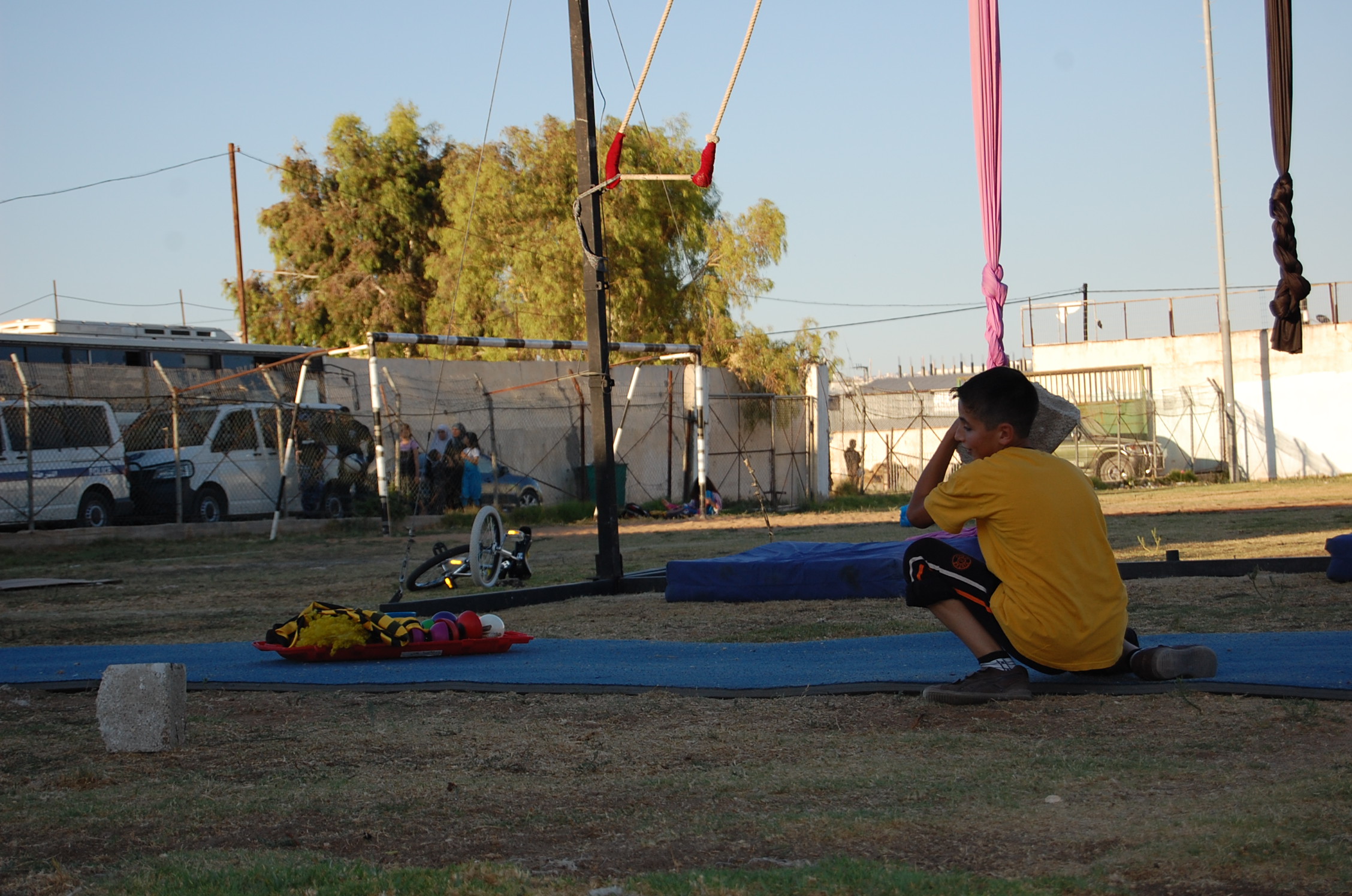 A colour photograph of the Palestine Circus School's production, "The Mobile Circus" in the Israeli-occupied city of Jenin in 2010. With a suite of training courses for all sections of society, the show featured a cast including, Ahmad Taleb, Alaʾ abu ar-Rub, Fady Zumurud, Hazar Azza, Laur Ṣadeq, Marah Ashmar, Mayrouby Makhluq, Muhammad abu ar-Rub, Muhammad abu Kishek, Muhammad abu Taleb, Muhammad al-Azza, Muhammad Ghayth, Muʿtaṣem Ghayth, and Yazan ʿWaydat.
