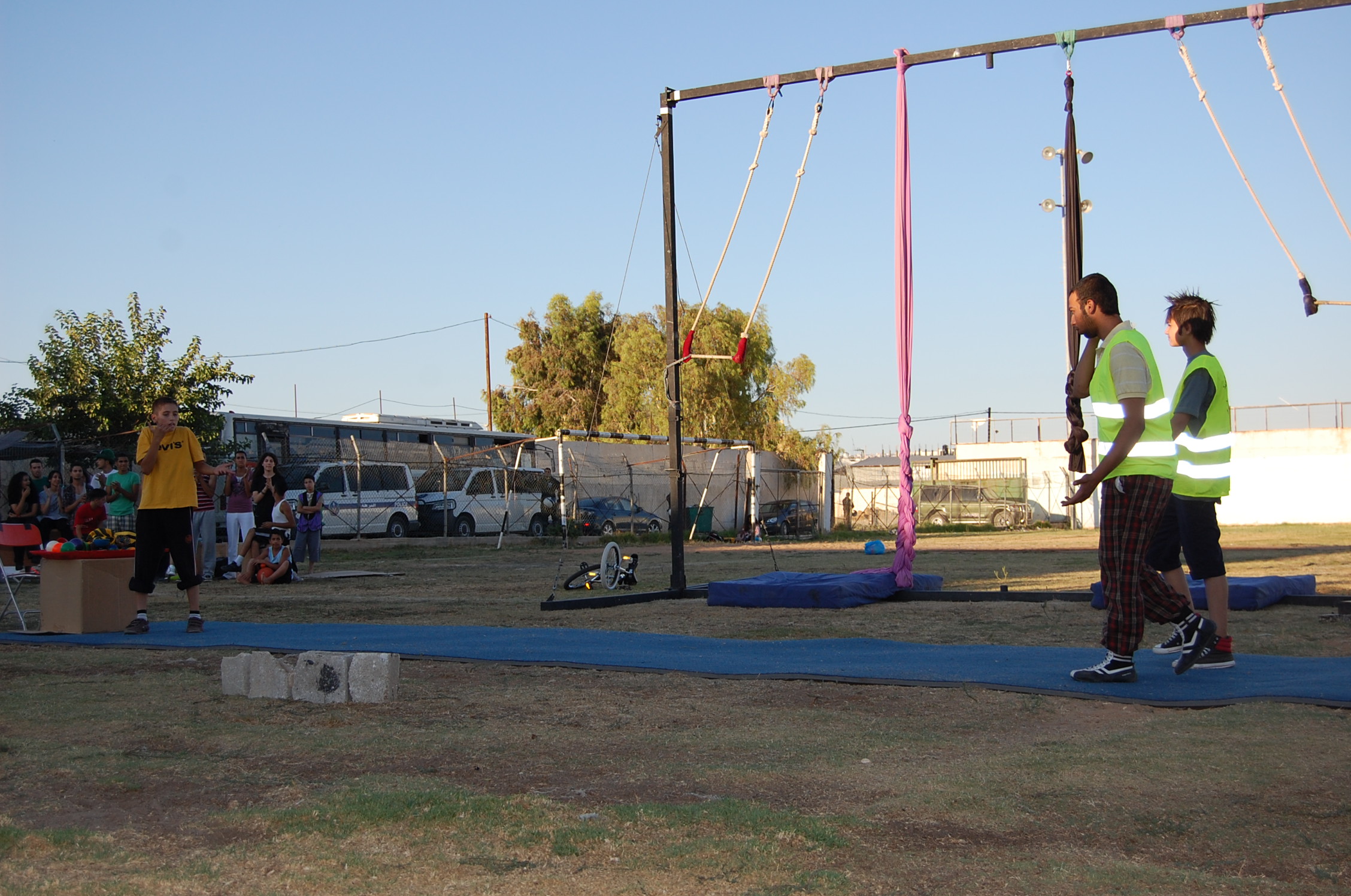 A colour photograph of the Palestine Circus School's production, "The Mobile Circus" in the Israeli-occupied city of Jenin in 2010. With a suite of training courses for all sections of society, the show featured a cast including, Ahmad Taleb, Alaʾ abu ar-Rub, Fady Zumurud, Hazar Azza, Laur Ṣadeq, Marah Ashmar, Mayrouby Makhluq, Muhammad abu ar-Rub, Muhammad abu Kishek, Muhammad abu Taleb, Muhammad al-Azza, Muhammad Ghayth, Muʿtaṣem Ghayth, and Yazan ʿWaydat.
