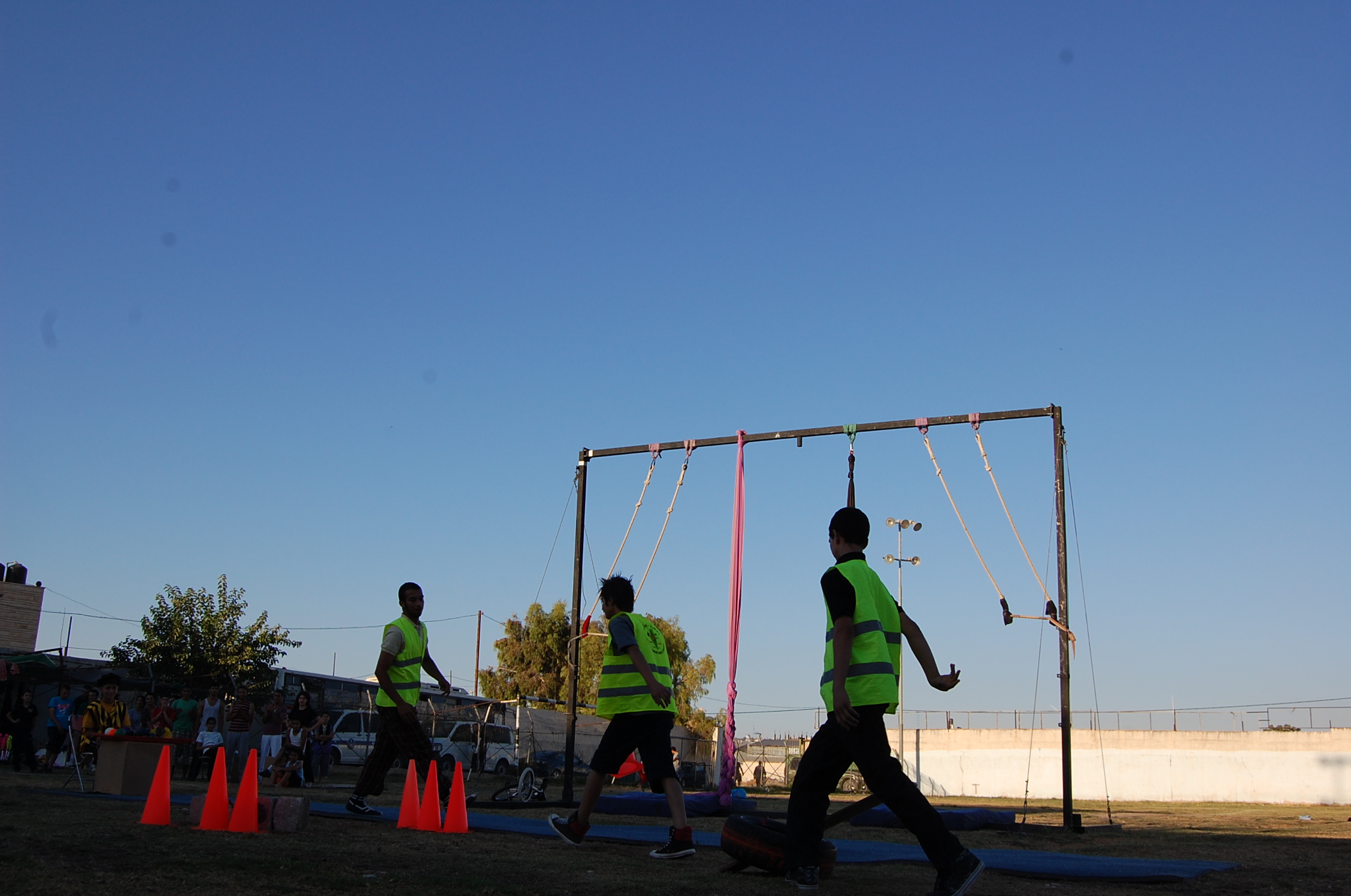 A colour photograph of the Palestine Circus School's production, "The Mobile Circus" in the Israeli-occupied city of Jenin in 2010. With a suite of training courses for all sections of society, the show featured a cast including, Ahmad Taleb, Alaʾ abu ar-Rub, Fady Zumurud, Hazar Azza, Laur Ṣadeq, Marah Ashmar, Mayrouby Makhluq, Muhammad abu ar-Rub, Muhammad abu Kishek, Muhammad abu Taleb, Muhammad al-Azza, Muhammad Ghayth, Muʿtaṣem Ghayth, and Yazan ʿWaydat.