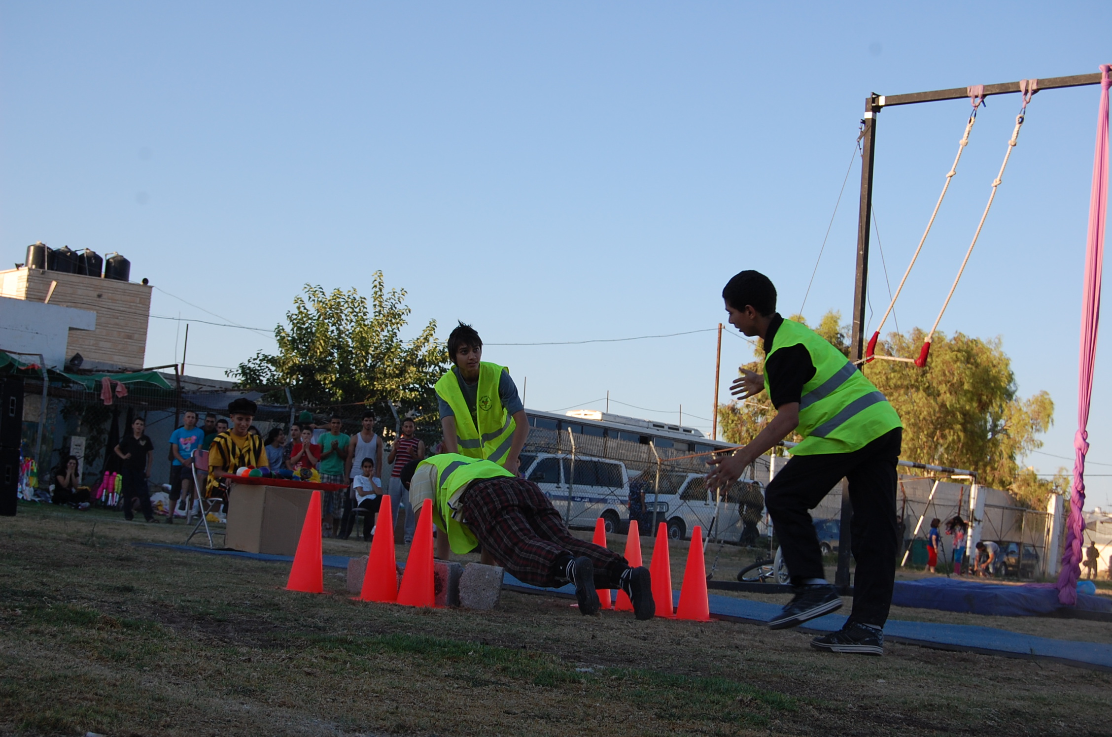 A colour photograph of the Palestine Circus School's production, "The Mobile Circus" in the Israeli-occupied city of Jenin in 2010. With a suite of training courses for all sections of society, the show featured a cast including, Ahmad Taleb, Alaʾ abu ar-Rub, Fady Zumurud, Hazar Azza, Laur Ṣadeq, Marah Ashmar, Mayrouby Makhluq, Muhammad abu ar-Rub, Muhammad abu Kishek, Muhammad abu Taleb, Muhammad al-Azza, Muhammad Ghayth, Muʿtaṣem Ghayth, and Yazan ʿWaydat.