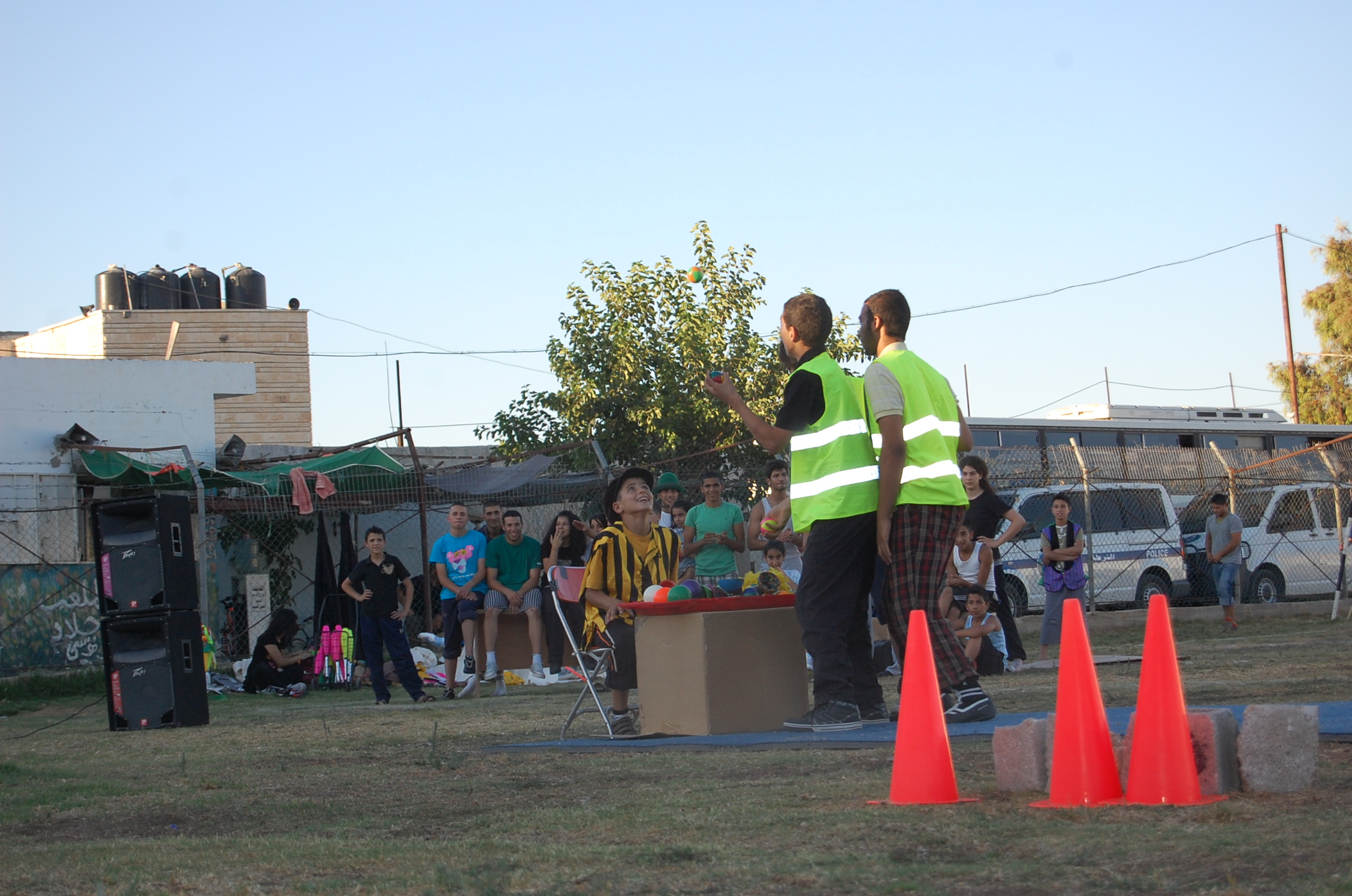 A colour photograph of the Palestine Circus School's production, "The Mobile Circus" in the Israeli-occupied city of Jenin in 2010. With a suite of training courses for all sections of society, the show featured a cast including, Ahmad Taleb, Alaʾ abu ar-Rub, Fady Zumurud, Hazar Azza, Laur Ṣadeq, Marah Ashmar, Mayrouby Makhluq, Muhammad abu ar-Rub, Muhammad abu Kishek, Muhammad abu Taleb, Muhammad al-Azza, Muhammad Ghayth, Muʿtaṣem Ghayth, and Yazan ʿWaydat.