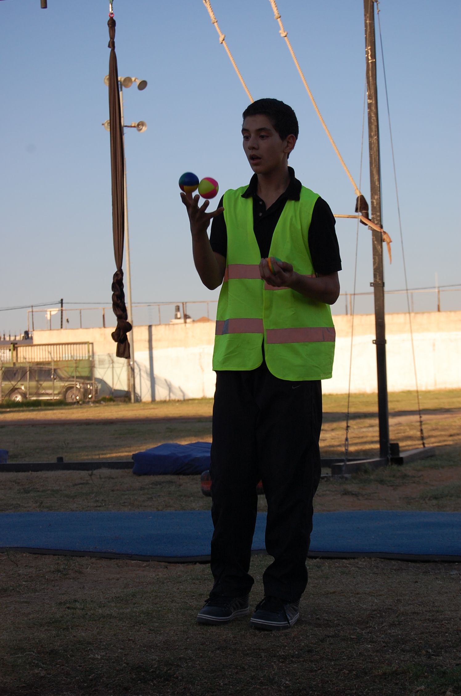 A colour photograph of the Palestine Circus School's production, "The Mobile Circus" in the Israeli-occupied city of Jenin in 2010. With a suite of training courses for all sections of society, the show featured a cast including, Ahmad Taleb, Alaʾ abu ar-Rub, Fady Zumurud, Hazar Azza, Laur Ṣadeq, Marah Ashmar, Mayrouby Makhluq, Muhammad abu ar-Rub, Muhammad abu Kishek, Muhammad abu Taleb, Muhammad al-Azza, Muhammad Ghayth, Muʿtaṣem Ghayth, and Yazan ʿWaydat.